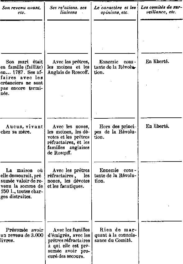 Pour ne pas tomber dans des redites, en rapportant tous les mandats d'arrêt lancés par le comité de surveillance, nous reproduisons ici un tableau fort intéressant, expédié dans le courant de ventôse par le comité de Salut public de Paris, à tous les comités de surveillance des départements de la République. L'ancien secrétaire de la mairie de Saint-Pol, M. Henry, eut l'obligeance de nous donner communication de ce tableau dont l'original se trouve aux archives départementales.