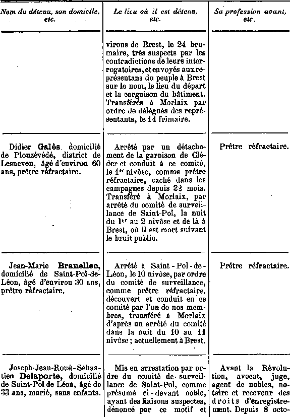 La plupart de ces arrestations étaient si précipitées et s'opéraient d'une façon si irrégulière que le tribunal révolutionnaire de Brest, qu'on ne taxera pas de modération, se croyait parfois comme obligé de demander de nouveaux éclaircissements au comité de surveillance de Saint-Pol.