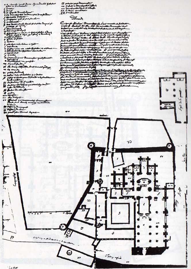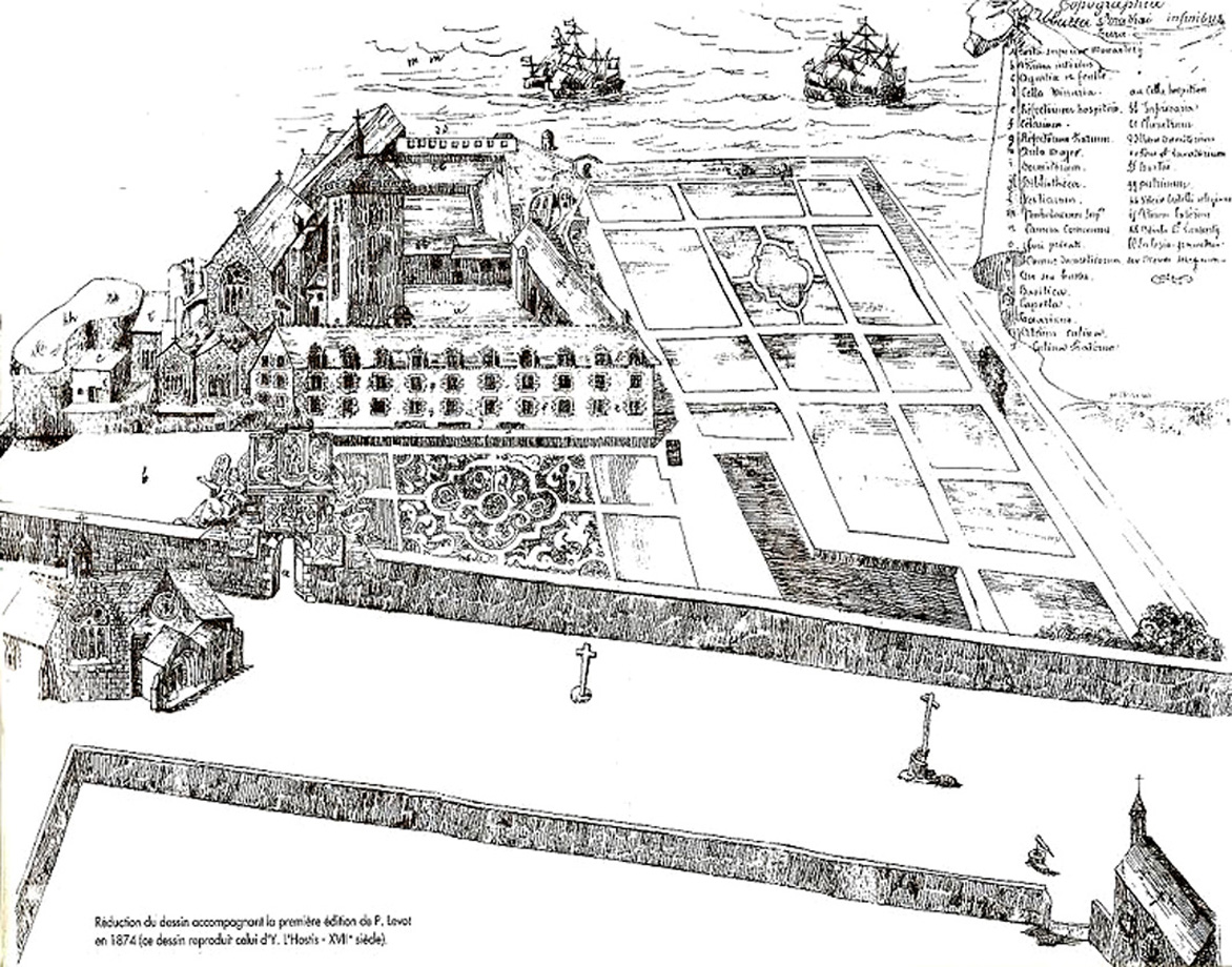 L'auteur des Brièves remarques donne, de son côté, la description suivante du monastère : « Il y avoit autresfois sur le cap une forte ville qui n'est plus qu'un gros bourg. Le monastère estoit basti comme un chasteau, comme il paroist encore des restes des murailles, lesquelles sont hautes et faites comme celles d'une ville, et furent faictes un peu après l'an 1419, comme il conste d'un acte expédié le 1er juillet de la mesme année ….. Le cloistre est petit et passable ; au bout duquel à l'occident il y avoit un dortoir où il paroist dix fenestres. Le réfectoire estoit tout proche, comme l'on voit par ses murailles et celles de la cuisine proche les murailles de laquelle il y a une très belle et très bonne fontaine. Le monastère est si proche de la mer qu'il s'est faict une concavité dessous l'église où la mer va la longueur de 40 ou 50 pieds sans danger toutes fois à raison que c'est un rocher et que ceste ouverture n'est large. Tout autour du monastère c'est un des pays des meilleurs de la Basse-Bretagne pour les bleds ; mais l'on n'y voit ni hayes ni buissons. Le monastère est tout entouré de mer, excepté d'un côté, etc., etc. ».