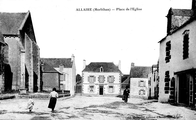 Nota : Allaire, situé dans la partie orientale du diocèse, entre l'Arz et la Vilaine, est borné au nord par Saint-Jacut et Saint-Perreux, à l'est par Saint-Jean-la-Poterie, au sud par Rieux et Béganne, et à l'ouest par Saint-Gorgon. Sa superficie actuelle est de 4,169 hectares, et en y ajoutant Saint-Gorgon, son ancienne trêve, on arrive au chiffre de 4737 hectares. Ce territoire, mêlé de plaines et de collines et arrosé de plusieurs cours d'eau, est fertile en froment, seigle, blé noir... ; on y voit de belles prairies, mais aussi des landes étendues. Sa population, d'après le recensement de 1886, est de 2373 habitants. Le bourg, presque central, est à 7 kilomètres de Redon et à 49 de Vannes. Sur ce territoire on n'a encore signalé aucun monument de l'époque celtique ou préhistorique. La période gallo-romaine y est représentée par la voie, qui va de Vannes à Rieux et qui passe au sud-ouest du bourg. Les Bretons, à partir du VIème siècle, y ont établi quelques colonies, comme le prouvent les noms encore subsistants de Branbic, Coeslé, Deil, Bot, Kerlaurent, etc... En 878, Alain Ier, comte de Vannes et de Nantes, qui séjournait souvent au château de Rieux, tomba malade à Alair, et y reçut l'Extrême-Onction, des mains d'Armengair, évêque de Nantes : cérémonie que certains auteurs ont transformée, par distraction, en sacre ou en couronnement (Cartulaire de Redon, p. 183). Dix ans plus tard, en 888, Guérech ou Quérac, fils du même Alain, tomba malade à Bren-Helmelin, en Allaire ; les moines de Redon se mirent en prières pour lui, et le jeune prince recouvra la santé (Ib. p. 375). L'abbaye de Redon acquit dans cette paroisse quelques propriétés, comme l'indique cette note du Cartulaire, rédigé vers l'an 1080 : ln Halaer, ecclesia sancti Johannis nuncupata, sita super ripam Hult fluminis (p. 285). Ce texte prouve en outre que, au XIème siècle, le quartier de Saint-Jean-des-Marais faisait encore partie de la paroisse d'Allaire. Le souvenir des Croisades y est rappelé par le village du Temple, situé sur les confins d'Allaire et de la Poterie, et par la maison de la Maladrerie, qui a dû remplacer un hôpital de lépreux (Joseph-Marie Le Mené - 1891).