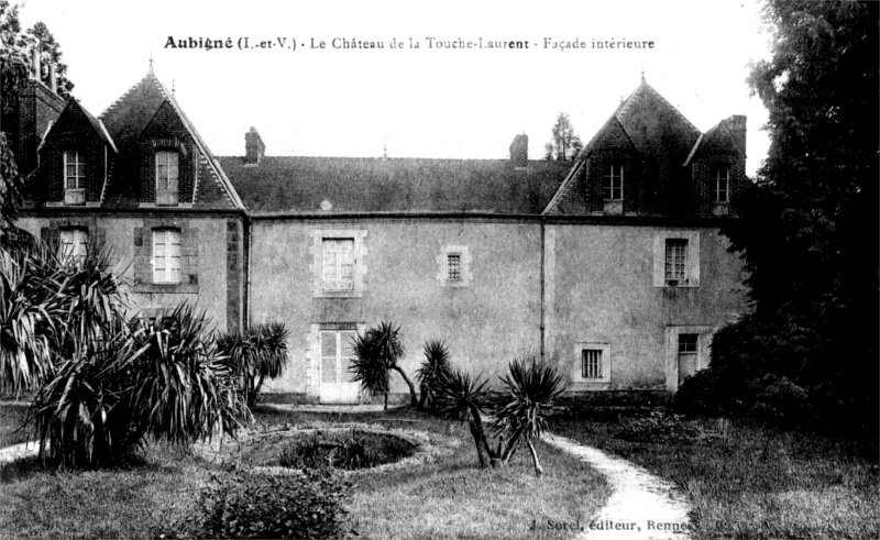Depuis bien longtemps aussi le château d'Aubigné, quoique restauré en 1457, est tombé en ruines ; cependant son assiette existe toujours, c'est une aire assez vaste entourée de douves encore larges et profondes ; dans cette enceinte s'élève, à l'une des extrémités, un fragment considérable du donjon : il se composait d'une grosse tour, ronde à sa base et octogone dans sa partie supérieure. Ces ruines assez pittoresques, entourées de prairies remplaçant d'anciens étangs, ornent un jardin anglais créé depuis quelques années par le propriétaire actuel qui habite l'ancien logis prioral d'Aubigné. Voilà tout ce qui demeure de cette importante construction féodale qu'élevèrent et habitèrent les sires d'Aubigné et que ruinèrent probablement les guerres de la fin du XVème siècle (abbé Guillotin de Corson).