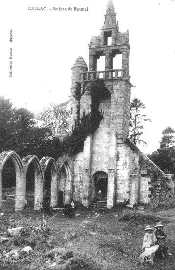 Nota 2 : LES RUINES DE BOTMEL. Au nord de la ville de Callac se trouvent les ruines de l'antique église de Botmel. Bâtie au cours du XIVème siècle elle eut à subir de nombreuses vicissitudes tantôt de la part du temps, mais surtout de la part des hommes. Elle fut maintes fois restaurée, si bien que peu à peu elle perdit son cachet primitif, et en 1863, l'abbé David écrivait dans " Le Lannionnais " que seule subsistait une fenêtre du XIVème siècle. Ce qui en reste, (puisque l'église de Botmel fut démolie il y a plusieurs années) la tour et trois arcades, est classé monument historique. La tour fut reconstruite en 1634 elle menaçait ruine, dit un manuscrit du temps ; c'est de cette époque que date le joli campanile qui la surmonte. Faisons donc le tour de ces ruines. Voici le porche surmonté d'une niche, où se trouvait autrefois la statue de Notre-Dame de Botmel. Ce porche est flanqué d'accolades affectant la forme de colonnettes, du plus gracieux effet ; en dessus rampent des crochets délicatement fouillés, et en haut, juste en dessous de la niche, se trouve un joli fleuron. Ce porche d'un dessin sobre et hardi, est surmonté d'une balustrade au-dessous de laquelle on remarque une grande pierre portant une inscription. A droite du porche se voient deux tourelles, l'une à hauteur de la balustrade, par où l'on accède sur cette dernière, l'autre, plus basse, dont on remarque le pignon surmonté d'un chien sculpté. Un escalier en colimaçon se trouve à l'intérieur de ces deux tourelles, il donne accès sur la balustrade d'où l'on jouit d'un merveilleux spectacle. L'église de Botmel était d'un style sobre à peine quelques pierres sculptées, gargouilles et autres, ce qui d'ailleurs n'enlevait rien à son charme. Des deux cloches qui se trouvaient autrefois dans la tour, il n'en reste plus qu'une. Elle se trouve dans la tour de l'église actuelle et, on la sonne la veille et le jour de la fête de saint Laurent, c'est pour cela qu'on la nomme " cloche de saint Laurent ". Elle fut baptisée en 1467. La statue de Notre-Dame de Botmel existe toujours. C'est une statue très ancienne et très curieuse. En effet, la Vierge a les bras en croix et, son attitude semble indiquer qu'elle s'élève. Autrefois lors des grands pardons on revêtait cette statue d'habits somptueux : tunique blanche richement brodée et voile bleu piqué d'étoiles d'or. On entourait la niche de feuillages et de guirlandes de verdure. C'était un touchant spectacle de voir les fidèles défiler sous le porche où trônait Marie et se former en une longue théorie qui se déroulait lentement dans la campagne au chant des cantiques et des invocations. Notre-Dame de Botmel, priez pour nous ! Hélas, Botmel est en ruines. Les ronces poussent dans le sanctuaire et sur les tombes du petit cimetière. Le vieux beffroi vide de cloches, n'est plus maintenant que le refuge des corneilles et des hiboux. De loin il a l'aspect d'un burg sauvage ou de quelque vieux donjon seigneurial abandonné (J. Guillotin).