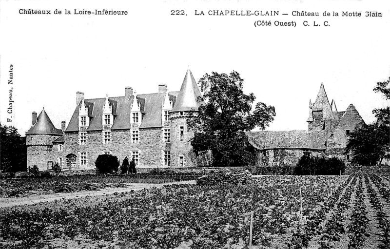 Note de Charles Chaussepied : Au Nord-Est du département de la Loire-Inférieure, à la limite de l'Anjou, est située la petite commune de la Chapelle-Glain, à peu près à égale distance entre Châteaubriant et Ancenis. C'est là que se trouvait l'ancienne châtellenie de la Motte-Glain, qui dépendait de la baronnie d'Ancenis et dont les terres s'étendaient sur une assez vaste superficie entre les routes nationales d'Angers à Niort, et d'Ancenis à Laval. Cette châtellenie jouissait des droits de Haute et Basse Justice civile et criminelle, avec potence à quatre piliers. Sa juridiction s'exerçait sur plusieurs paroisses. Elle avait droit de chasse et de pêche sur tous ces territoires et en temps de guerre pouvait compter sur ses vassaux. Le Château fut construit sur la rive gauche d'une petite rivière que l'on nomme le Don, mais qui porte aussi le nom de ruisseau de Salmonnais, à l'endroit où ce cours d'eau alimente un vaste étang aujourd'hui envasé et couvert de roseaux. Une première habitation seigneuriale fut élevée au XIème siècle, entre 1050 et 1080 par Glain de Rougé, dont la famille le conserva jusqu'en 1415. A cette époque, le domaine passa entre les mains de Patey de Chateaugiron, neveu de Jean de Rougé décédé sans enfant. Celui-ci fut tué au siège de Pontorson en 1427 et comme il était célibataire, La Motte-Glain passa en héritage à sa sœur Valence de Chateaugiron, baronne de Derval, qui peu après épousait son cousin Geoffroy de Chateaugiron, dit de Malestroit, chevalier de Combourg. Des enfants de ce mariage, Marguerite de Malestroit reçut le domaine en partage qu'elle passa en second mariage dans la famille de Penhoet. Ces derniers occupèrent le château pendant 35 ans, de 1440 à 1475. Françoise de Penhoet, fille de ce Jean de Penhoet, épousait Pierre de Rohan, seigneur de Gié et Maréchal de France, de la puissante famille de Rohan qui, vers 1495, entreprit la reconstruction du Château, mais ayant beaucoup d'autres domaines et ne séjournant nulle part, tout occupé de guerroyer, il s'en désintéressa et les travaux furent abandonnés. Ce fut lui cependant qui eut l'insigne honneur de recevoir le roi Charles VIII et la reine Anne de Bretagne, de passage dans le pays en 1497. Il donna de grandes fêtes à cette occasion ; on dépensa beaucoup d'argent en festins, mais il fallut boucher provisoirement les fenêtres de la chambre royale pour qu'elle puisse être occupée par les souverains. Les de Rohan conservèrent pendant plus d'un siècle la Motte-Glain jusqu'en 1635, où Louis de Rohan le vendit à Michel Le Lou, conseiller au Parlement de Bretagne. Un autre Louis de Rohan, en 1565, avait reçu la visite royale de Charles IX et de sa mère Catherine de Médicis. qui venant de Châteaubriant retournaient à Paris. Comme ce passage tombait le 4 novembre, le monarque assista à la messe dans la petite chapelle du château. Le nouveau propriétaire entreprit l'achèvement des constructions, mais ne put les terminer. Le mariage de Louise-Françoise Le Lou, héritière de la seigneurie épousait le 3 août 1722 Joachim Robineau, seigneur de Rochequairie. Cette nouvelle alliance garda la Motte-Glain jusqu'en 1909. Ce Joachim Robineau qui devint châtelain de La Mothe-Glain, était d'une noble famille du Poitou. Il possédait La Rochequairie en Saint-Etienne-du-Bois, et était capitaine des Gardes sur les côtes de l'île de Bouin. Un descendant de cette famille épousait en 1770 Marie Ursule de Maillé de la Tour Landry, morte à la Motte-Glain en 1776. Charles Alexandre Marquis de Robineau de Rochequairie, châtelain de la Motte-Glain, dans la seconde moitié du XIXème siècle, entreprit en 1898, d'importantes réparation au château, mais qu'il ne put terminer ; les extérieurs seuls furent remis en état. Il mourut célibataire en 1910, et eut pour héritier son beau-frère, le comte Ferdinand Urbain de Charette de la Contrie, né en 1837, qui fut zouave pontifical et sous-lieutenant aux Volontaires de l'Ouest pendant la guerre Franco-Allemande et reçut la Croix de la Légion d'Honneur. Il avait épousé à Briançon le 18 décembre 1877 Marie Robineau de Rochequairie l'héritière, soeur de Charles-Alexandre, laquelle mourut en 1922, laissant le domaine à son fils Ferdinand qui l'occupe à partir de 1910. Comme toutes les demeures seigneuriales, le château de la Motte-Clain eut à souffrir de la tourmente révolutionnaire ; de 1793 à 1795, il fut saccagé de fond en comble. Les archives furent brûlées, les meubles détruits ou dispersés, l'argenterie volée et les belles tapisseries qui décoraient les murs déchirées ou emportées. Sous le premier Empire il servit un moment de garnison aux soldats de Napoléon qui, entre parenthèse, ne le respectèrent guère. Dans son état actuel (situation en 1930), il aurait besoin de grosses et nombreuses réparations : la mise en état des grands appartements de réception, la réfection des couvertures, principalement au Chatelet s'imposent ; sans parler de la reconstruction des quelques bâtiments détruits et l'achèvement de la Tour du Grand Escalier. Le Château que nous voyons aujourd'hui (c'est-à-dire en 1930) et qui, malgré ses parties détériorées ou inachevées, fait encore l'admiration des visiteurs, tant par l'imposante étendue de ses bâtiments que par la richesse de sa décoration, est donc une construction de la fin de l'art ogival, c'est-à-dire de ce style Louis XII, empruntant déjà quelques éléments à la Renaissance. Les principaux bâtiments qui composent cette habitation paraissent à peu près de la même époque. Ce n'est déjà plus le château féodal avec ses créneaux, son donjon et ses tours, mais la demeure accueillante où les moyens de défense n'étaient plus qu'illusoires et ne figuraient là que par tradition et pour donner un air d'importance aux habitations. C'est ainsi que l'on remarque le léger encorbellement du haut des tours, port