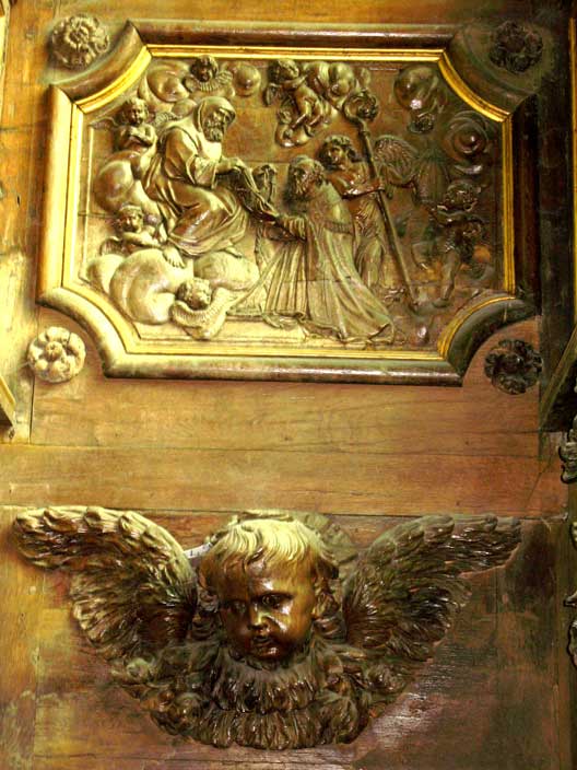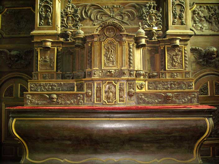 Couronnant des scènes empruntées au Nouveau ou à l'Ancien Testament, des médaillons avec palmes et pots à feu présentent les profils du Christ et de la Vierge.
