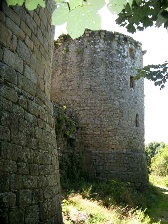 Continuant la visite sur la droite, on remarque que le rempart décrit une rentrée en demi-cercle, dans laquelle s'élève une forte tour, dont le contour totalement circulaire, est entièrement détaché du corps de la place ; du moins n'y tient-il que par deux pans de murs qui, de droite et de gauche, vont s'unir au rempart. On n'entrait dans cette tour que par une fenêtre du second étage, d'où s'abattait un pont-levis joignant le parapet de la muraille opposée. La tour est surmontée des restes d'une tourelle. Il n'y a pas lieu de douter que toutes les autres tours de ce château n'eussent été pareillement, selon l'usage du temps, munies de tourelles avant qu'on ne les eût démantelées (d'après Fréminville).