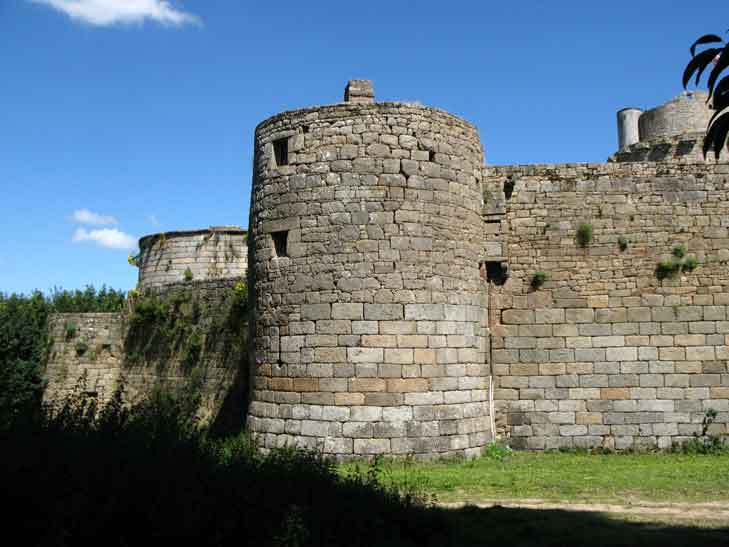 Le château de Tonquédec est situé sur une hauteur qui domine la rivière du Guer. Il offrait, par son assiette, une de ces positions militaires de premier ordre si appréciées au XIIIème siècle. Cette position était rendue plus forte encore par les remparts garnis de meurtrières, barbacanes et machicoulis, en pierres de taille de grand appareil et d'une épaisseur de quatre à cinq mètres, les tours au nombre de onze se commandant et battant le rempart, les douves alimentées par l'étang du château et entourant sa triple enceinte ; système de défense complet qui en faisait une des plus redoutables forteresses du moyen-âge. |