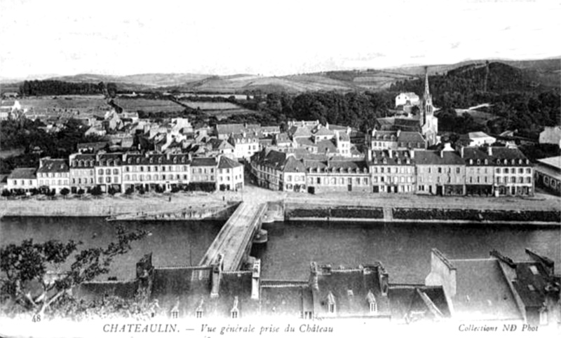 Châteaulin prend son essor près du château fort situé au lieu-dit Vieux-Bourg, bâti, semble-t-il, par Budic Castellin, comte de Cornouaille au Xème-XIème siècle. Non loin de là, labbaye de Landévennec établit un prieuré dédié à Saint Idunet (prieuré de Loc-Idunet ou Loc-Yonet) et autour duquel sétablit un bourg appelé Locyonnet ou Loguionnet. Un troisième bourg sinstalle à Lostrat. Vers le XVème siècle, est créé un bourg unique sous le nom de Châteaulin, regroupant les trois bourgs précédemment cités.