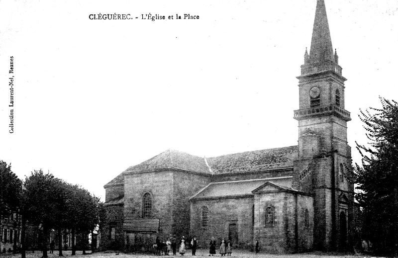 Nota : L'église paroissiale est dédiée à saint Guérec. L'ancien édifice avait été construit à plusieurs reprises ; la nef était ancienne. Le maître-autel était surmonté d'un baldaquin, soutenu par des colonnes torses ; les chapelles latérales étaient sous les vocables de saint Nicolas, de saint Yves, etc... , et renfermaient plusieurs tombes prohibitives. La nouvelle église, en forme de croix latine, avec des bas côtés, appartient au plein cintre, et n'offre rien de particulier : elle a été consacrée par Mgr Gazailhan le 17 octobre 1864. Une tour en pierre s'élève au bas de la nef et complète l'édifice. Les chapelles de la paroisse sont les suivantes : — 1. La Trinité, vers l'ouest, près du village de Poulmain. — 2. Saint-Jacques, tombée en ruines, relevée en l'honneur de Sainte-Anne. — 3. Sainte-Madeleine, à 4 kilomètres vers le nord. — 4. Saint-André, à 5 kilomètres vers le nord-est, près du Blavet. — 5. Saint-Jean-Baptiste, à 1,500 mètres au sud-est du bourg, de style ogival. — 6. Sainte-Vierge, à Locmaria, datée de 1578, restaurée récemment. — 7. Saint-Gildas, au village de Locqueltas, à 5 kilomètres vers le sud-est. — 8. Saint-Morvan ou Morvan, près de Stival. Dans cette dernière chapelle, on voit un curieux cercueil en granit, grossièrement taillé et renflé vers le milieu ; son couvercle en biseau se courbe en arc de la tête aux pieds ; une partie du couvercle est brisée, ce qui permet de voir à l'intérieur la place de la tête légèrement accusée par le ciseau. Ce cercueil, à l'intérieur, mesure en longueur 2m,20, en profondeur 0m,27, en largeur à la tête 0m,53, au milieu 0m,75, et aux pieds 0m,41. Il pourrait bien remonter au commencement du VIème siècle. — Près de la chapelle, sur le bord de la route, se trouve une sorte de Lech quadrangulaire, haut de 1m,60 environ, et portant sur une de ses faces une croix en relief, à croisillons légèrement pattés. A la liste des chapelles de Cléguérec, il faut ajouter : Sainte-Brigitte, devenue chef-lieu de paroisse, Saint-Aignan, également érigé en paroisse, Saint-Marc et Saint-Ignace, qui dépendent aujourd'hui de Saint-Aignan. Il y avait aussi des chapelles privées aux châteaux de Bézidel, de Lenvos et de Beauregard. Les frairies étaient groupées autour du bourg et des douze chapelles de la paroisse. La chapellenie de Saint-Nicolas, la seule de la paroisse, avait été fondée par les seigneurs de Lenvos, et se desservait de deux messes basses par semaine, dans la chapelle de ce saint, qui formait l'aile sud de l'église paroissiale et qui appartenait aux fondateurs. Les dîmes de la paroisse appartenaient, de temps immémorial, à l'évêque de Vannes ; dans les derniers siècles, elles se levaient à la 33ème gerbe. Le recteur, nommé à l'alternative, était portionnaire et jouissait des novales ; en 1756, son revenu net était évalué à 1,010 livres. Cléguérec faisait partie du doyenné de Guémené et de la sénéchaussée de Ploërmel. En 1790, il fut érigé en commune, mais il perdit, pour le civil, ses deux trêves de Saint-Aignan et de Sainte-Brigitte, qui furent également érigées en communes. En compensation, il devint chef-lieu de canton du district de Pontivy, et eut dans son ressort : Séglien, Malguénac, Stival, Saint-Aignan et Sainte-Brigitte. En 1791, son recteur, D.-J. Jan , refusa de prêter le serment à la constitution civile du clergé, et vit bientôt un intrus envahir son troupeau. Détenu à la Retraite de Vannes en 1793, et au Petit-Couvent en 1794, il mourut vers 1796. Pendant les troubles, on vendit nationalement le bois du presbytère, une maison et plusieurs terres appartenant à la fabrique, les arbres des chapelles de la Trinité et de Saint-Jacques, la maison et le jardin dépendant de la chapellenie de Saint-Nicolas. Le pays fournit quelques volontaires à la Chouannerie en 1795. A la suppression des districts, en 1800, Cléguérec passa dans l'arrondissement de Pontivy. Au remaniement des cantons, en 1801, il conserva son titre, perdit Stival, et acquit Silfiac, Neulliac et Kergrist, en conservant Séglien, Malguénac, Saint-Aignan et Sainte-Brigitte. A la réorganisation du diocèse, en 1802, Cléguérec fut rétabli comme paroisse, mais dans les limites de la commune ; Saint-Aignan fut érigé en succursale, et Sainte-Brigitte, unie à Silfiac pour le service religieux, n'eut le même titre qu'en 1820 (Joseph-Marie Le Mené - 1891).