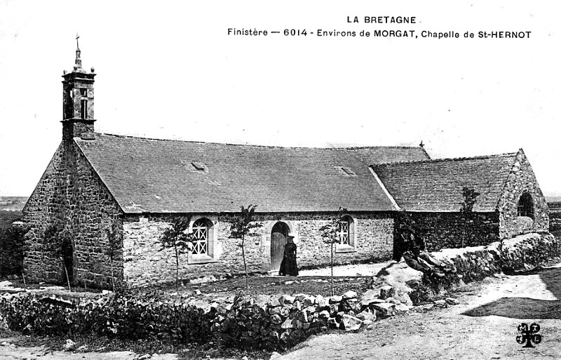 Pointe de la Chèvre (M. du Châtellier) : « A 200 mètres Sud de Saint-Norgat, tumulus de 2 mètres de haut et 25 mètres de diamètre. Exploré en 1883, il nous a donné une chambre intérieure construite en pierres sèches recouvertes d'une table dolménique. Cette belle sépulture mesurait 2 m. 30 de long sur 0 m. 92 de large et 1 m. 30 sous plafond, contenait sept dépôts de restes incinérés placés sur sept dalles posées sur le fond de la sépulture, sans mobilier funéraire. A 300 mètres au Sud du village de Saint-Hernot, tumulus de 2 m. 50 de haut et 20 mètres de diamètre. Fouillé on 1883, il contenait trois sépultures formées de pierres placées de champ en terre, recouvertes de dalles. Elles ont donné des restes de squelettes, des poteries brisées, une hache en pierre polie, des éclats de silex et des percuteurs » (Musée de Kernuz). Dolmen de Rostudel, à la pointe, et un menhir à 200 mètres à l'Ouest du dolmen.