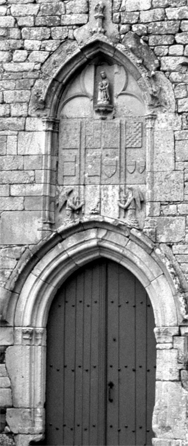 Mais tout l'intérêt de la chapelle se concentre autour de la façade d'entrée à l'ouest. La porte d'entrée, tout à fait caractéristique des années 1400 par ses colonnettes avec chapiteaux est surmontée d'une baie avec décor de choux frisés qui comprend un bas-relief. Ce bas-relief présente un ensemble héraldique sculpté tout à fait unique en Bretagne. Trois anges prenant appui sur l'extrados de l'entrée y tiennent cinq bannières et trois blasons. Malheureusement, l'œuvre du temps a rendu presqu'illisibles ces armoiries. On dispose toutefois de deux descriptions. Frotier de La Messelière exécuta un relevé de l'ensemble en 1898. Il crut reconnaître de gauche à droite et de haut en bas, les armoiries des Malestroit (de gueules à 9 besants d'or, représentées ici avec 8) dans les deux premières, des armoiries non identifiées portant un lambel en chef dans la troisième bannière et dans la quatrième bannière, la plus lisible aujourd'hui, les armes ducales de Dreux-Bretagne. Les deux autres bannières et les trois écus porteraient les armes de Châteaugiron d'or au chef d'azur, seules ou en alliance dans la sizième bannière et le troisième écu [Note : FROTIER de La MESSELIÈRE, Documents héraldiques du département d'Ille-et-Vilaine, Saint Brieuc, Prud'homme, 1946].