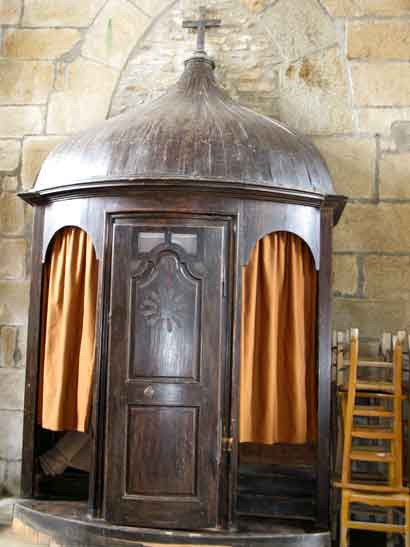La chaire à prêcher (1744) : réalisée en bois des Iles par François de Lesquelen, elle est ornée de bas-reliefs étonnamment naïfs (les 4 Evangélistes et la Vierge) ; au-dessus de l'abat-voix, l'ange du jugement dernier ; en-dessous, le Saint-Esprit souffle sur le prédicateur, inspiré par le crucifix qui lui fait face.