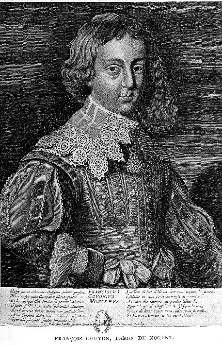 Amaury II et Catherine de Champagne laissèrent trois fils : Amaury III, dont nous parlerons tout à l'heure, Brandelis, baron du Juch, tué dans les guerres de Hollande du vivant de son père, et François, baron de Nogent, dit le baron de la Moussaye. Ce dernier eut une carrière militaire assez brillante, grâce à l'amitié du grand Coudé, qui lui fit conférer le grade de maréchal de camp en 1644, puis le nomma lieutenant général de ses troupes et gouverneur de Stenay, où il mourut en novembre 1650 [Note : Il existe trois portraits de François Gouyon, par Le Blond, Aubry et Montcornet (voir Iconographie bretonne du marquis de Surgères, t. I, p. 209.) Nous sommes heureux de reproduire le portrait exécuté par Jehan le Blond, dont un exemplaire appartient à M. le comte de Palys, qui l'a très aimablement mis à notre disposition. C'est une fort belle pièce, où François Gouyon, FRANCISCVS GOYONIVS MOVSSAEVS, est représenté jeune, richement habillé, avec dédicace en vers latins et français].