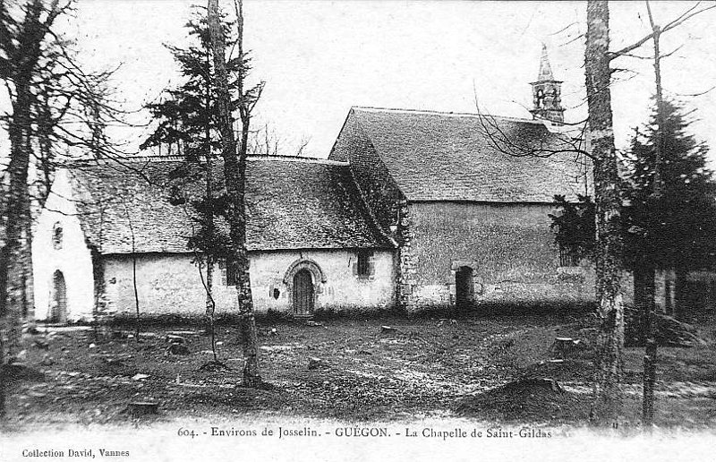 Nota 1 : L'église paroissiale de Guégon est dédiée aux apôtres saint Pierre et saint Paul. La nef et les transepts sont de style roman du XIIème siècle, avec des fenêtres étroites, très évasées à l'intérieur. Les quatre gros piliers de l'inter-transept, qui supportent la tour, sont également romans ; mais les arcades qui les relient sont déjà ogivales et d'une date postérieure : la tour, en effet, serait de l'an 1400, suivant les registres paroissiaux. En 1456, on refit la charpente de la nef, d'après une inscription, gravée sur une sablière. La chapelle da transept sud appartenait aux seigneurs de Coetby ; on y voit encore quelques restes de vitraux, et deux pierres tumulaires, avec des croix en relief très usées. Le collatéral sud du choeur, en style ogival, date de 1560, et forme une jolie chapelle, dédiée à la sainte Vierge. Le vitrail du fond, donné en 1563 par Jean Thomé, chanoine de Vannes et recteur de Guégon, représente les apôtres tenant des philactères où sont inscrites les paroles du Symbole. La sacristie fait le pendant de cette chapelle au nord ; elle est voûtée en pierre, et éclairée par une fenêtre ogivale à quatrefeuille. Le clocher, qui était jadis un des plus élevés du diocèse, puisqu'on lui donnait 200 pieds, fut frappé de la foudre en 1627 et en 1677, et enfin renversé par une violente tempête dans la nuit du 28 décembre 1705. Celui qui existe aujourd'hui est bien moins élancé. Les chapelles publiques sont : — 1. Saint-Antoine, au sud-est, dans un lieu isolé. — 2. Saint-Gildas, au village de ce nom, vers le sud-ouest. — 3. Saint-Méen, au village du Bourne. — 4. La Trinité, à Canfrou, vers le nord-ouest. Il y avait en outre les chapelles privées de Coetby, de la Ville-Even, et de Cléhinet. C'est de cette dernière qu'on transféra solennellement à l'église paroissiale, le 19 décembre 1763, une parcelle de la Vraie-Croix, donnée par Vincente-Louise Hardouin, dame de la Hatrye. Les frairies étaient, en dehors du bourg, Saint-Antoine, Saint-Gildas, Saint-Méen, la Trinité, la Ville-Bernard, la Ville-Ruaud. Les chapellenies étaient les suivantes : — 1. Celle de Coetby, fondée le 15 avril 1589 par Jean du Val, seigneur de Coetby, desservie d'une messe chaque dimanche dans l'église paroissiale, et dotée de deux mines de seigle, mesure de Porhoet. — 2. Celle de la Ville-Even, fondée par les seigneurs du lieu et desservie dans la chapelle du manoir. — 3. Celle de Cléhinet, fondée en 1734 par la susdite dame de la Hatrye, et chargée de deux messes par semaine, le mercredi et le samedi. — 4. Celle de Guillaume Nizan, desservie dans l'église paroissiale et dotée d'une maison au bourg, avec un jardin, un pré et une pâture. — 5. Celle de Guillaume Janvier, desservie, paraît-il, dans la chapelle de Saint-Antoine. — 6. Celle du prêtre Pierre Danet, fondée vers 1740, chargée d'une messe tous les vendredis au maître-autel, et dotée d'une maison avec quelques terres. Le recteur dîmait sur toute l'étendue de sa paroisse à la 33ème gerbe, sauf quelques exceptions. En 1757, son revenu net était évalué à 1,500 livres ; il payait 187 livres d'impositions, et une pension de 30 livres au Chapitre. Guégon dépendait de la seigneurie et du doyenné de Porhoet, et de la sénéchaussée de Ploërmel. En 1790, il se vit érigé en commune et en chef-lieu de canton du district de Josselin, et eut dans sa circonscription : Coetbugat, paroisse supprimée, Tréganteur son ancienne trève, Saint-Servan et Quily. Son recteur, M. Julien Giquello, refusa, en 1791, de prêter le serment à la Constitution civile du clergé ; il fut ensuite détenu à Vannes comme sexagénaire, et enfin rétabli après le Concordat. Pendant les troubles, on vendit nationalement plusieurs pièces de terre appartenant à la fabrique et à la dotation des chapellenies Nizan et Danet. De leur côté, les Chouans comptèrent de nombreux volontaires dans cette paroisse. Guégon perdit son titre de canton en 1801, pour faire partie de celui de Josselin. Il perdit également, en 1802, sa trève de Trégranteur, qui fut érigée en succursale, et, en 1840, l'ancienne paroisse de Coetbugat, rétablie comme succursale. Ces modifications ecclésiastiques ont laissé intacte la circonscription civile de la commune, sauf pour quelques villages voisins de Cruguel (Joseph-Marie Le Mené - 1891).