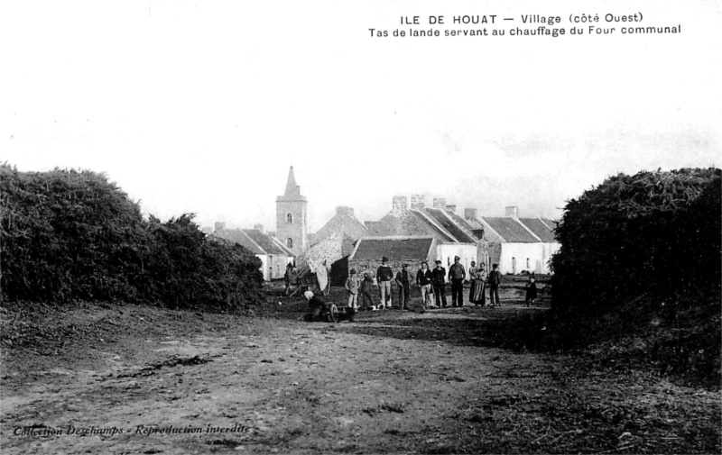 Note 1 : Cette île, soeur de Hoedic, porte un nom breton, qui signifie canard. Ces oiseaux viennent en effet s'abattre en hiver par bandes nombreuses sur les rochers du voisinage. Houat est protégé par de nombreux îlots, qui, jadis, ont dû faire partie de son territoire ; la chaussée du Béniguet n'est sans doute que le reste de l'isthme qui le reliait à Quiberon. Sa superficie en 1891 est de 600 hectares, et sa population de 260 habitants seulement. La côte de cette île est plus sauvage, plus déchirée, plus élevée, que celle de Hoedic. En plusieurs endroits sa hauteur est de plus de 30 mètres. On y rencontre de belles grottes creusées par les vagues, et de petites baies remplies de sable jaune. Les Celtes ont laissé sur ce sol de nombreuses traces de leur séjour. Sans parler des fragments de silex et de poteries, on trouve encore au centre de l'île quatre menhirs, dont un debout, et en divers lieux cinq ou six dolmens plus ou moins ruinés (Bull. 1885, p. 106). Pour la période romaine, on n'a trouvé que des monnaies de Vespasien ; aucune traçe d'établissement des conquérants. Cependant l'île leur était connue, et portait alors le nom de Siata ou plutôt Hiata, devenu plus tard Horata. Cette île était presque déserte, quand saint Gildas vint s'y cacher en 524. Il établit son ermitage dans le petit vallon nommé Lenn er hoet (l'étang du bois), et bâtit à côté une petite chapelle pour y dire la messe. C'est de là qu'il partit pour fonder, vers 528, le monastère de Rhuys. Le saint abbé revint souvent dans sa chère solitude de Houat : on y montre encore un rocher sur lequel il laissa l'empreinte de son corps, pendant que ses disciples recueillaient sur le rivage des soles envoyées par la Providence. Les animaux venimeux disparurent de l'île à sa prière, et jamais depuis, malgré les tentatives de la malveillance, ils n'ont pu s'y perpétuer. C'est là enfin qu'il mourut le 29 janvier 565, à 71 ans. Il est très probable que ses disciples conservèrent avec vénération les traces de son séjour dans l'île et qu'ils y eurent dès lors un petit établissement dépendant de l'abbaye de Rhuys. Au Xème siècle, Houat, comme Hoedic, eut beaucoup à souffrir des invasions normandes, et les moines furent tués ou chassés, comme la majeure partie de la population. Au XIème siècle, saint Félix y envoya de nouveaux moines et de nouveaux colons. On y construisit une chapelle, dont les ruines subsistent encore, et les religieux administrèrent les sacrements à la population, jusqu'à ce qu'un prêtre séculier en reçut la charge (V. Luco, p. 242). Les Anglais pillèrent cette île, en 1548, et la menacèrent en 1573. Les Hollandais à leur tour ravagèrent les environs en 1674, ce qui décida le roi à faire construire en 1693 un fort circulaire sur la pointe nord-est et un autre en fer à cheval sur la pointe nord-ouest. En 1696, les Anglais pillèrent Houat, mais ils n'osèrent attaquer les forts où la population s'était refugiée. En 1746, ils revinrent mieux armés, firent capituler la garnison et détruisirent les fortifications. Le fort de l'est, restauré en 1756, fut repris en 1761, et rendu à la paix de 1763. Au point de vue militaire, Houat dépendait du gouverneur de Belle-île, et au point de vue ecclésiastique de l'abbé de Saint-Gildas qui présentait le curé, lui payait une pension de 120 livres et percevait la dîme. En 1790, Houat fut annexé à la commune de Palais. Son curé, M. Lorcy, ayant refusé le serment schismatique, fut arrêté à la fin de 1792 et conduit à Port-Louis, puis à Rochefort. Libéré au commencement de 1795, il revint dans son île, y reçut les débris de l'expédition de Quiberon, et ayant contracté une maladie en soignant les blessés, il mourut victime de sa charité, à l'âge de 35 ans. Avant de retourner en Angleterre, le commodore eut soin de faire sauter les forts de Houat et de Hoedic. A la réorganisation du diocèse en 1802, Houat fut érigé en paroisse, aussi bien que Hoedic, et resta annexé à la commune et au canton de Palais. L'église paroissiale, dédiée à saint Gildas, et reconstruite en 1766, n'a rien qui mérite de fixer l'attention de l'archéologue. Non loin du bourg, on a construit, de 1847 à 1854, un nouveau fort, de forme carrée, avec quatre bastions, destiné à dominer toute l'île et les parties de la mer qui sont sous ses feux ; de simples batteries occupent l'emplacement des anciens forts. Des travaux semblables ont été exécutés dans l'île soeur. Quant aux moeurs et au gouvernement de Houat, ils sont exactement les mêmes qu'a Hoedic. Houat a été érigé en commune par une loi du 16 décembre 1891 (Joseph-Marie Le Mené - 1891).