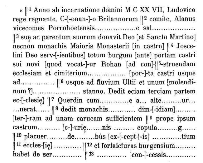 Dom Lobineau et Dom Morice ont connu ce document et l'ont publié (Dom Lobineau, Histoire de Bretagne, T. II, Preuves : col. 156 ; - Dom Morice, Histoire de Bretagne, T. I, Preuves : col. 554). Leur publication, contrairement à ce que dit M. du Halgouët, (H. DU HALGOUET. La Vicomté de Rohan ..., p. 2, note 1), diffère sensiblement de le copie des Blancs-Manteaux donnée par M. Rosenzweig. Il est certain que les savants Bénédictins ont eu l'original entre les mains, comme ils l'affirment ; mais, à la fin du XVIIème siècle, le parchemin était déjà très endommagé et presque aussi difficile à lire qu'aujourd'hui, si bien que le texte qu'ils nous ont transmis n'est pas, en réalité, une transcription, mais nous offre une adaptation des divers fragments lisibles de l'acte, comme on s'en rendra facilement compte en le comparant avec celui que nous avons donné plus haut (Note : M. l'abbé MARTIN a publié et traduit le texte des Bénédictins dans son Histoire de Rohan Saint-Gouvry, 1104-1926, p. 14 et 15. Il dit à tort, page 12, que l'original de la donation d'Alain de Porhoët est conservée dans la collection des Blancs-Manteaux, ms. fr. 22319) :