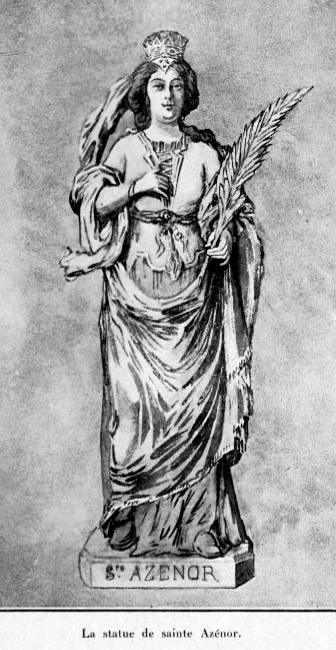 L’une des tours du Château de Brest, datant en partie du XIIIème siècle, porte encore le nom de Tour Azénor. A Châtelaudren, dans la chapelle de Notre-Dame du Tertre, sur les lambris, de curieuses peintures du XVème siècle racontaient l’histoire de sainte Azénor. A Porspoder, dans l’ossuaire transformé en chapelle, un très ancien retable redit aussi ses touchantes tribulations. Le rentier du Folgoët, dans les extraits qu’en donne M. de Kerdanet dans sa Notice sur Notre Dame du Folgoët, mentionne le 5 Août 1421, la donation d’un champ par Azénor Moal, et ce champ porte le nom de Parc Azénor. Il y a encore dans le pays, des femmes — peu nombreuses cependant — qui portent le joli nom d’Azénor ou d'Honorée, car Azénor est devenu Enor, Enori, Honorée, et en breton on dit le plus souvent « santez Enori ou santez Honorée ». Il y a aussi des Honorine et des Eléonore qui, probablement, ont pour patronne sainte Azénor ; en remontant dans le passé, on trouverait que leurs marraines sont des Enori ou des Honorée. |