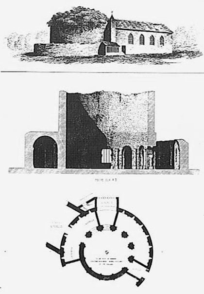 Ils me dispensent de revenir sur la description complète de ces rares vestiges de l'architecture religieuse du commencement du XIIème siècle ou de la fin du XIème en Bretagne, inspirés très vraisemblablement par le souvenir du Saint-Sépulcre de Jérusalem. Comme lui, l'église en question est composée de deux enceintes circulaires concentriques. L'enceinte intérieure, le chœur, la nef, est percée de 12 arcades en plein cintre, à double retrait, avec de lourds piliers carrés, aux tailloirs sans moulures, les courtes colonnes engagées surmontées de chapiteaux grossiers qui supportent le cintre au milieu, et les longues colonnes engagées, en partie détruites, qui devaient monter jusqu'au haut du mur pour soutenir les arceaux d'une voûte en pierre ou les pièces de charpente d'un toit. L'espace situé entre le chœur et l'enceinte extérieure, aujourd'hui presque entièrement détruite, formait bas côtés, collatéral, déambulatoire. Il était partout voûté en pierre, voûtes d'arête dont on voit quelques restes assez bien conservés dans la partie est. Peut-on en dire autant de la nef ? Qu'elle ait été couverte, cela ne semble pas douteux mais elle aurait pu l'être par une toiture en bois, en tuiles ou même en ardoise Les architectes de cette époque hésitaient à établir des voûtes en pierre lorsqu'elles étaient larges ; nous sommes ici en présence d'une portée de dix mètres, nécessitant une coupole qui eût exigé des arcs-boutants de contrefort au grand mur, peu épais, destiné à la porter. Or, il n'y en a pas de traces. Tout semble dénoter, dans la construction de cet édifice, la recherche des procédés les plus simples et les moins coûteux. Par qui a-t-il été élevé ? Par un chevalier breton, compagnon du duc Alain-Fergent en Terre-Sainte, en témoignage de reconnaissance au Dieu dont il avait invoqué l'aide, au milieu des combats, ou par quelque pieux pèlerin du Goëllo que hantait le souvenir de ce qu'il avait vu à Jérusalem ? Plusieurs églises, tant en France qu'en Angleterre, ont été construites sur le même modèle. Au retour des premières croisades, qui ont eu un si grand retentissement dans le monde chrétien, les récits enthousiastes de ceux qui avaient prié sur le tombeau du Christ ont dû suggérer aux architectes la pensée de reproduire dans des monuments religieux la forme du Saint-Sépulcre. A noter que c'est au XIème siècle que, dans ses régions schisteuses, la grande et épaisse ardoise a commencé à être employée concurremment avec la tuile. (Viollet-le-Duc, Dictionnaire d'architecture).