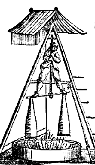 Qu'on veuille bien se figurer deux solives, ou montants, formant, avec le sol, un triangle dont la hauteur est à peu près de cinq mètres, et maintenues en équilibre par un arc-boutant, comme cet instrument appelé chèvre, dont on se sert pour soulever des matériaux d'un grand poids. Une chaîne fixée au sommet soutient par le milieu une traverse ou barre horizontale, sorte de fléau de balance, chacune des extrémités duquel sont fixés deux énormes pilons verticaux en pierre dure, présentant la forme d'une poire. Au-dessous des pilons, se trouve une auge également en pierre, où se dépose l'ajonc qu'il s'agit de piler. Un homme, cramponné à la chaîne, debout, les jambes écartées, sur la traverse à laquelle il atteint par des barreaux échelonnés le long d'un des montants, appuie alternativement sur les deux bouts de cette traverse, et met en mouvement les pilons, l'un après l'autre, ayant soin de remuer souvent l'ajonc, au moyen d'une longue perche, armée d'un crochet à sa partie inférieure.