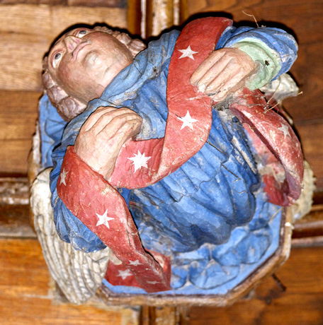 La charpente est remarquable. Les arêtiers, moulurés, sont ornés de pendentifs, représentant douze angelots qui entourent la Sainte-Trinité sculptée sur la clef pendule du carré du transept. Aux quatre angles de celui-ci, les arêtiers sont supportés par les statues des quatre évangélistes ; les sablières son également sculptées.