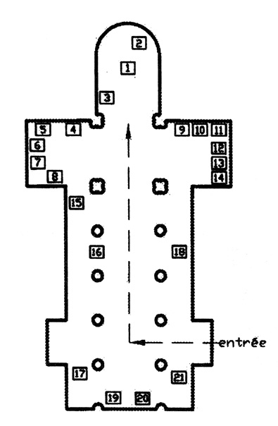 Pour la visite, nous allons monter par la nef jusqu'au chœur. Les numéros dans les commentaires renvoient au plan.