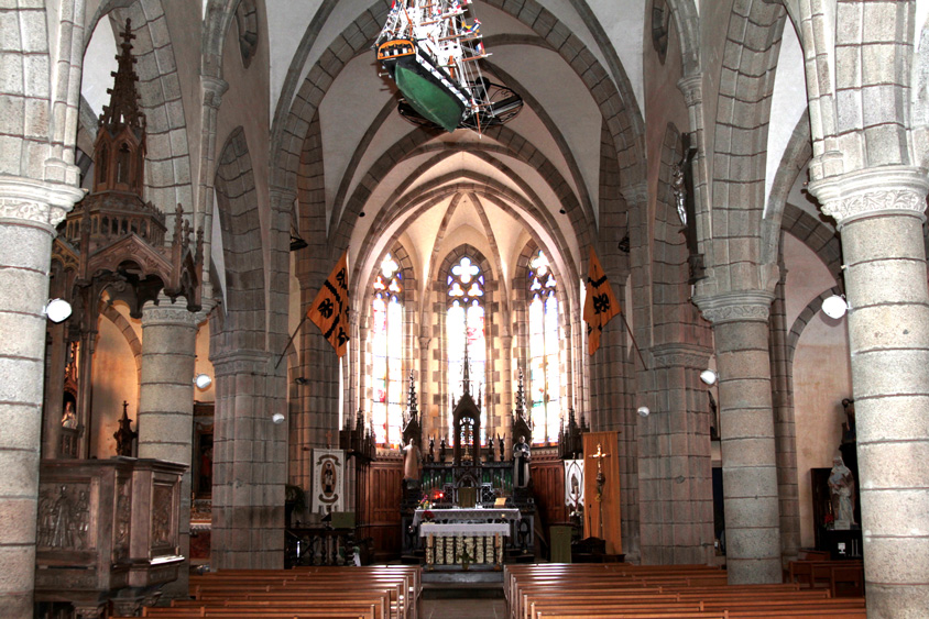 2) Derrière le maître-autel, dans le vitrail central des femmes de marins saluent leurs maris partant à la pêche en Islande. Les deux bateaux suspendus à la voûte sont des ex-votos offerts par des marins que Saint Yves a sauvés du naufrage et de la noyade.