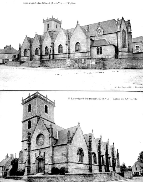 Note 2 : liste non exhaustive des recteurs de la paroisse de Louvigné-du-Désert : Gualand (vers 1040). Jean Deguilles (recteur en même temps de Combourg et de Landéan, en 1517). Guy Deguilles (1542). Jean Lothon (sieur de la Fumerais, en 1596). Guy de Guiller (1621). Pierre Jouey (1642, il résigna le 2 février 1663 en faveur de Jean Langevin, diacre d'Avranches). Jean Cousin (il succéda au précédent, décédé, malgré la résignation susdite ; il rendit aveu au roi pour son presbytère le 31 décembre 1678). Gilbert Hodebert (1683, il fit en 1698 enregistrer ses armoiries : d'azur à trois bandes d'or, et prit part au synode de 1701). René de Marguerit (il se démit en 1705). Jean Ferron (prêtre du diocèse, pourvu le 26 mai 1705, il rendit aveu en 1733 au seigneur de Monthorin pour son presbytère et son pourpris ; décédé en 1740). Jean-François Crosnier (pourvu le 29 juin 1740, il résigna en faveur du suivant). Jean Crosnier (pourvu le 22 février 1764, il résigna en 1785). Joseph Beauce (pourvu le 16 février 1785, il gouverna jusqu'à la Révolution et fut réinstallé en 1803 ; décédé le 12 février 1831, âgé de soixante-dix-sept ans). Jean Goltais (1831, décédé en 1835). Joseph Provost (1836-1865). Pierre Cardinal (1865, décédé en 1877). Jean-Marie Marsolliau (à partir de 1877), .....