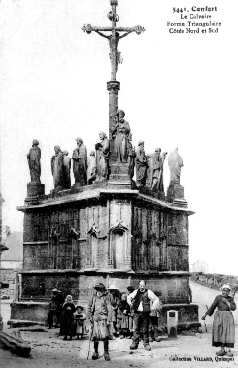 Nota 3 : LE CALVAIRE. Le calvaire monumental qui se dresse devant la façade principale peut être classé au nombre des calvaires de second ordre. Il est constitué par un massif de maçonnerie de forme triangulaire dont les angles sont armés d'éperons. Sur chacune des faces, légèrement concaves, sont percées trois niches. Chaque éperon en a une autre. Soit un total de douze. Autrefois ces niches abritaient les statues des douze Apôtres. Pendant la Révolution, elles furent décapitées et mutilées puis enterrées auprès de l'église. Ce n'est qu'en 1849 qu'elles furent retrouvées. Plus tard, elles furent restaurées et placées dans les niches de la façade Ouest de l'église, où elles sont d'un bel effet. Vers 1870, Yann Larc'hantec, de Plougonven, dont l'atelier se trouvait d'abord à Morlaix, ensuite à Landerneau, fut chargé de sculpter de nouvelles statues pour le calvaire. Il s'en acquitta soigneusement. Au lieu de loger les Apôtres dans les niches, il les campa tout autour de la plate-forme, au-dessus de la corniche, et il faut convenir qu'ils offrent ainsi une silhouette imposante, dominés par une grande croix fort artistique, taillée par le ciseau du même ouvrier breton. L'église et le calvaire (sans les statues modernes) sont classés comme monuments historiques. Mentionnons enfin la « Maison du Prieur », qui se trouvait auprès de l'église et qui a été démolie il y a quelques années. Elle était construite sur le modèle des nombreuses gentilhommières de la contrée. On n'en a gardé qu'une seule fenêtre et deux belles cariatides. De la porte d'arcade qui donnait accès dans la cour, il ne subsiste que quelques assises moulurées. En 1737, Corentin Ansquer, de Lesvoalc'h, en Plouhinec, était prieur de Confort (Archives du diocèse de Quimper et de Léon).