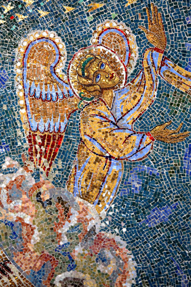 ouvert dans sa main le livre sacré où deux yeux symboliques rappellent la