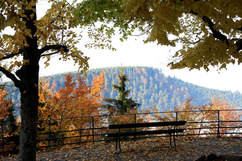 Au débouché du cloître [Note : C'est ici, en avant du grand escalier, que les travaux en cours ont modifié le plus profondément, et de très heureuse façon, l'ancien aspect des lieux ; en supprimant l'antique véranda — disgracieuse bâtisse, reléguée maintenant derrière le parc d'autos — et en abaissant tout l'espace libéré au niveau des Chapelles des Larmes et des Anges, ils mettent en valeur non seulement ces deux Chapelles qu'ils ont totalement dégagées, mais la grande terrasse elle-même qui ainsi domine vraiment tout l'ensemble], nous voici subitement face à l'horizon le plus vaste, le plus varié, le plus beau devant nous, la montagne à perte de vue : la croupe de l'Elsberg d'abord, et derrière elle le Heidenkopf ; puis, à gauche de celui-ci et jusqu'au Champ du Feu, dont la tour se détache sur le ciel à l'ouest, ce sont les Vosges, si belles dans cette parure bleu-sombre qui leur est propre et qui leur sied si bien.