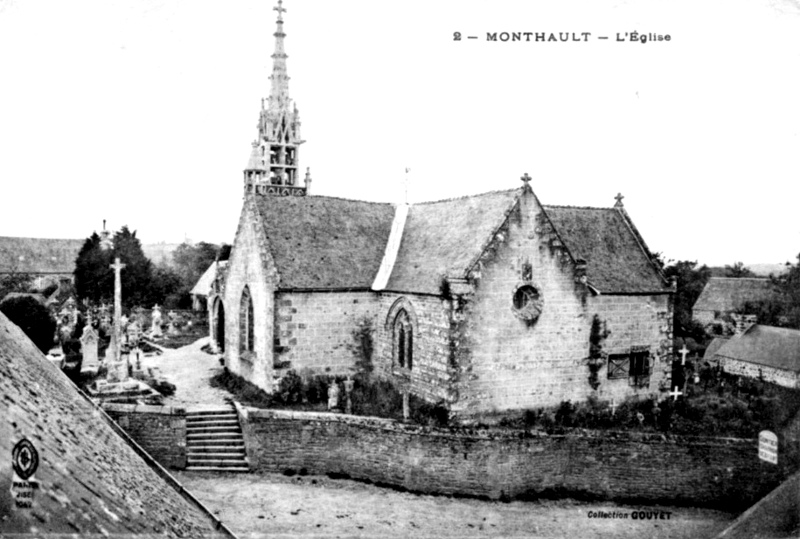 On ne sait rien des commencements de cette paroisse, qui est cependant ancienne ; on trouve bien vers 1150 un chanoine de Rillé appelé Jean de Montault (Dom Morice, Preuves de l'Histoire de Bretagne, I, 607), et ailleurs un Guillaume de Montault, mais on ne peut assurer qu'ils appartinssent à une famille seigneuriale de ce nom (nota : Il est à noter cependant qu'on voyait naguère encore en Monthault deux mottes féodales appelées les Châteaux, et offrant la même disposition que celles du Châtel, en Marcillé-Raoul). Nous ignorons également sur quoi repose la tradition disant que la paroisse de Monthault a d'abord porté le nom de Saint-Pierre-des-Bois. « Tout ce que nous savons sur cette paroisse, — dit M. Maupillé, — c'est qu'au commencement du XIIIème siècle elle était le siège d'un doyenné relevant de l'archidiaconé de Rennes et dont la juridiction devait embrasser toutes les paroisses de la vairie de Louvigné et une partie de celles du Coglais » (Notice historique sur les Paroisses du canton de Louvigné-du-Désert). Quoique ce doyenné ait été de bonne heure réuni à celui de Fougères, le recteur de Monthault n'en continua pas moins, jusqu'en 1698, à prendre le titre de doyen. La cure de Monthault était à la présentation de l'archidiacre de Rennes, qui levait quelques petites rentes dans la paroisse : 12 deniers monnaie sur le presbytère, 6 livres 2 sols sur les revenus de la cure et 2 sols 6 deniers sur les hommes d'un fief dit de l'Archidiacre. Le recteur de Monthault, M. Picou, était en 1790 mieux partagé que l'archidiacre : il levait toutes les dîmes de sa paroisse, grains, chanvres et lins, à la onzième gerbe, et estimait le tout 2 400 livres de rente ; il jouissait, en outre, d'un presbytère avec cour et jardin et d'une pièce de terre nommée la Petite-Aumône, ce qui lui rapportait 54 livres ; c'était donc un revenu total de 2 454 livres. Sur cette somme il lui fallait payer, il est vrai, la pension de son vicaire 350 livres, les décimes 180 livres, la rente due à l'archidiacre 6 livres 2 sols, et l'entretien du presbytère et du chanceau 130 livres ; il prétendait, de plus, dépenser chaque année 300 livres pour frais de récolte, de sorte qu'il déclara n'avoir de revenu net que 1 468 livres (Pouillé de Rennes). A la même époque, la fabrique de Monthault avait environ 100 livres de rente (Archives départementales d'Ille-et-Vilaine, 1 V, 27).