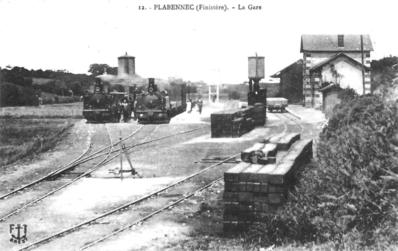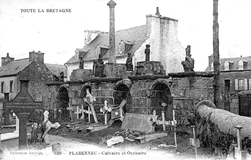 Nota : ANTIQUITÉS. Fréminville signalait, en 1832, près de la Croix des trois Recteurs, à l’embranchement des chemins de Plabennec et du Drennec, une roche arrondie presque ovoïde, portant à son extrémité la plus étroite une inscription en caractères inintelligibles. — A un kilomètre de la même Croix, on voit, ajoutait-il, dans un champ de genêts, un menhir à demi renversé, haut de 6 mètres. — A la même distance du bourg de Plabennec, dans une lande entourée de taillis épais, il signalait encore près de 600 blocs de pierre de 1 m. 30 d’épaisseur en moyenne, éparpillés sur le sol. En 1907, M. du Chatelier mentionne deux tumulus, l’un à 500 mètres Nord-Est du bourg, dans un champ appelé Park-an-Dorgen ; cet auteur y avait pratiqué des fouilles en 1881 ; quant à l’autre tumulus, fouillé vers 1900 par MM. Morvan et de Kerdrel, il dépendait du village de Roz-ar-Vern (Du Chatelier, Les Epoques Préhistoriques ...., 1907, pp. 146-147). Trois mottes sont signalées à Plabennec. L’une se trouve à 150 mètres au Sud de la ferme de Lesquelen. C’est un énorme monceau de terre mesurant 130 mètres de hauteur, avec une douve très profonde au Nord et au Nord-Ouest, moins creuse ailleurs. Sur la terrasse supérieure on voit quelques traces d’un édifice qui semble avoir été une tour de construction irrégulière. De nombreuses pierres de taille et de multiples moëllons gisent dans la douve et aux alentours, mais il ne semble pas que la butte ait été revêtue de pierres (Archives départementales. Fonds Le Guennec). Une seconde motte est à 150 mètres au Sud du village de La Motte ; une troisième au lieu dit Ar C'hastel. Flagelle parle d’un puits se trouvant dans la cour de l’ancien manoir de La Motte, où, en descendant de quelques mètres, on pouvait entrer dans une salle circulaire voûtée en pierres, de 10 à 12 mètres de diamètre (Notes Archéologiques sur le Département du Finistère, p. 41).