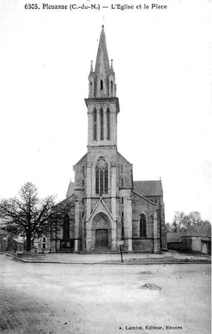 Nota : L'église Saint-Jacques et Saint-Philippe, en forme de croix latine, comprend un clocher extérieur avec tribune, une nef avec bas côtés de cinq travées, un transept peu accentué, et un choeur composé d’une travée droite et d’un chevet à trois pans. Au XIIème siècle, l'église était dédiée à saint Brieuc et fut donnée à Marmoutiers par Donoald, évêque d’Aleth. En 1432, le pape Eugène IV accorda des indulgences aux personnes qui contribueraient à la reconstruction de l'église et du presbytère de Plouasne. Parmi les recteurs qu’elle eut à sa tête au XVème siècle, il convient de citer, en 1490, le cardinal Balue. Au début du XIXème siècle, l'église menaçait ruines ; et, vers 1845, M. Mellet, architecte à Rennes, concluait, au cours d’une visite, à son entière reconstruction. La première pierre de l'édifice actuel, dû aux plans de M. Guépin, datés du 29 juillet 1867, fut posée en 1870 et les travaux exécutés en 1870 et 1871. L’église fut consacrée le 5 octobre 1876. Mobilier : Chaire datée de 1655. Parmi les statues modernes : saint Yves ; vitraux modernes de Fialeix (1873) (R. Couffon).