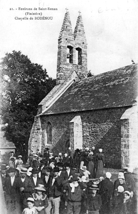 Nota 1 : Autres Chapelles : Le Père Cyrille Le Pennec nous apprend en 1647 que non loin de la chapelle de Bodonnou « feue demoiselle de Lanneuc, dame en son vivant de Coaténès, fist construire un petit oratoire en l'honneur de Nostre Dame du Rosaire, que les voysins visitent souvent, aux plus solennelles festes de la Sainte Vierge » (KERDANET, Les Vies des Saints, pp. 511-512). — A quelques centaines de mètres de Bodonnou, entre Bodonnou et Coatenez, existait au XVIIème siècle la chapelle Notre-Dame de Mezarès, dont étaient présentateurs les seigneurs de Coatenez. En 1687, Françoise de Penmarch, dame du Parc, déclare qu'elle est fondatrice de cette chapelle, bâtie par son aïeule, Barbe de Kerlec'h (PEYRON, Les églises et chapelles, p. 153). — Il est mention en 1583 d'une chapelle de Saint-Goulven ou de Saint-Marc, à laquelle présentaient les seigneurs de Kerourian, puis du Poulpry, puis l'Ordinaire. Elle valait 90 livres, à charge d'une messe dimanches et fêtes. — Une ancienne chapelle de La Madeleine relevait des seigneurs du Tréziguidy (PEYRON, Les églises et chapelles, p. 153). D'aucune de ces chapelles il ne reste de trace. Une chapelle domestique existe au manoir relativement récent de Kerango (Ker-an-Goff) à 5 kilomètres au sud du bourg. (H. Pérennès).