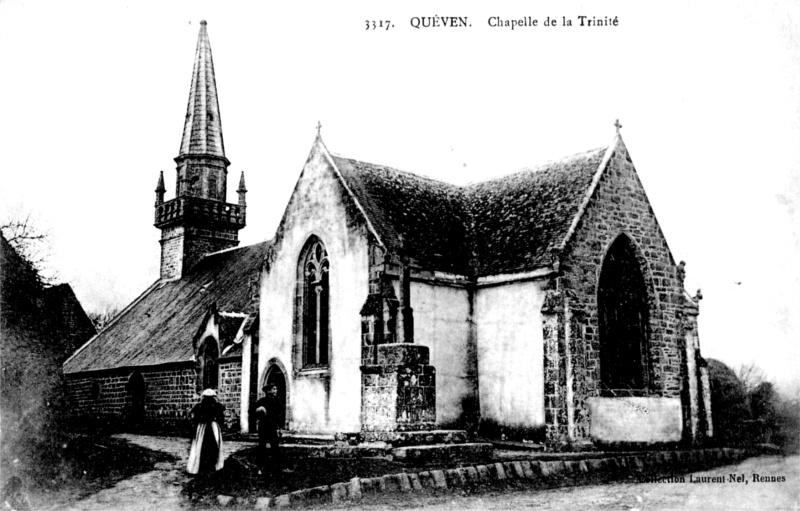 Nota : L'église paroissiale, dédiée à saint Pierre et à saint Paul, est moderne, et n'offre rien de remarquable. Elle a la forme d'une croix latine, avec un chevet semi-circulaire. Les autels latéraux sont sous le vocable du Rosaire et de saint Jean-Baptiste. Au bas de la nef, s'élève une tour carrée, surmontée d'une belle flèche en pierre, qui s'aperçoit de fort loin. Dans le cimetière, on remarque une croix prismatique en pierre, à deux traverses chargées de statuettes, figurant le Christ, la Vierge, les Apôtres, etc, ... en tout seize personnages adossés deux à deux. Sur le pied on lit ces mots gravés en capitales romaines : I. MARIA. Les chapelles publiques étaient les suivantes : — 1° Saint-Eloi, au bourg, édifice en forme de croix latine, construit au XVIème siècle et restauré au XVIIIème : on y voit des portes et des fenêtres en ogive, des arcs en plein cintre et des mascarons. — 2° Notre-Dame-de-Bon-Secours, à 2 kilomètres vers le nord-est, sur les bords du Scorff. — 3° Saint-Alouée (Alvosius), mentionnée par l'abbé Cillart, et depuis longtemps détruite. — 4° Saint-Nicodème, ou Notre-Dame-de-la-Rosée, à un kilomètre vers le sud-ouest ; sa forme est rectangulaire, les fenêtres sont ogivales, à meneaux flamboyants et trilobes, les postes en anse de panier ; au-dessus de celle du sud on lit : Jesus, 1578. — 5° La Trinité, à 1,500 mètres vers l'ouest ; sa forme est celle d'une croix latine, avec quatre travées d'architecture et contreforts simples. La fenêtre du choeur est ogivale, à meneaux flamboyants. Le portail occidental et sa tour en pierre sont de 1771. Le VIIIème dimanche après la Pentecôte, on s'y rend en pèlerinage pour obtenir la guérison de la fièvre. — 6° Saint-Philippe et Saint-Jacques à Béhoué, à 3 kilomètres vers l'ouest, siège d'une ancienne paroisse, aujourd'hui simple chapelle. Sa forme est celle d'une croix latine, dont le bras sud a disparu. A cette liste on peut ajouter la chapelle privée du château de Kerrousseau , dédiée à saint Maudé. Les frairies étaient, en dehors du bourg, Notre-Dame-de-Bon-Secours, Notre-Dame-de-la-Rosée, la Trinité, et les Saints-Jacques et Philippe. Les chapellenies étaient : — 1° Celle de Saint-Pierre, desservie dans l'église paroissiale et chargée d'un certain nombre de messes. — 2° Celle de Saint-Maudé, fondée et présentée par les seigneurs de Kerrousseau et Kersaho, et desservie dans leur chapelle de trois messes par semaine. — 3. Celle de Kervégan, ainsi nommée du lieu de sa dotation, et sur laquelle les autres renseignements font défaut. Le recteur de Quéven, à la nomination alternative du pape et de l'évêque, jouissait de la dîme sur toute sa paroisse, ainsi que du casuel. Il avait à payer son curé, mais son revenu net, en 1757, était encore évalué à 1135 livres. Quéven était du doyenné et de la seigneurie de Kémenet-Héboé et de la sénéchaussée d'Hennebont. En 1790, il fut érigé en commune, du canton de Guidel, et du district d'Hennebont. En 1791, son recteur, M. Le Guennec, eut la faiblesse de prêter le serment schismatique : ce qui le conduisit en 1794 à livrer ses lettres de prêtrise, et à être mis de côté à l'époque du Concordat. La Révolution vendit ici la chapelle de Béhoué et ses dépendances, les ruines d'une autre chapelle et la terre voisine, une tenue à Kervilien dépendant de la chapelle de Saint-Eloi, une tenue à la Trinité dépendant de la chapelle de ce nom, une tenue à Prat-lédan et une autre à Notre-Dame-de-la-Rosée appartenant à Quimperlé. Quéven passa dans l'arrondissement de Lorient en 1800, et dans le canton de Pontscorff en 1801 : ce qui fut accepté par l'Eglise en 1802, et n'a pas été modifié depuis (J-M Le Mené - 1891).