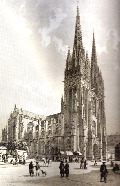 Pour compléter le tableau qui précède et terminer ce qui nous reste à dire de l'église Saint-Corentin, nous devons ajouter quelques observations sur le caractère architectural de l'édifice, sur la flèche centrale en plomb, enfin sur les maisons qui, de 1620 à 1680, envahirent tout le côté Nord de la cathédrale et les deux chapelles sous les tours.