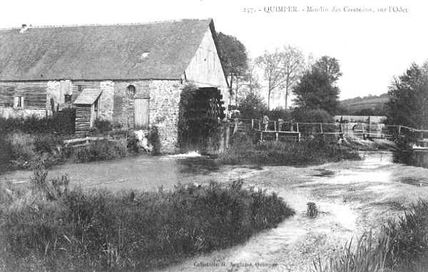 Au cours de la revue du vieux Quimper, nous avons trouvé le moulin de l'Evêque, au pied de l'Evêché, sur l'Odet, et le moulin du Duc, plus tard du Roi, au pied du Pichery, sur le Stéïr. En vous parlant de Locmaria, j'aurais dû signaler le moulin du Prieuré de Locmaria, dit aujourd'hui moulin des Couleurs, parce qu'on y broie les peintures employées dans une des faïenceries de Locmaria. Au voisinage de la ville et sur la colline qui la domine à l'ouest, était un moulin à vent dépendant du fief de Quémenet, au marquis de Pont-Croix.