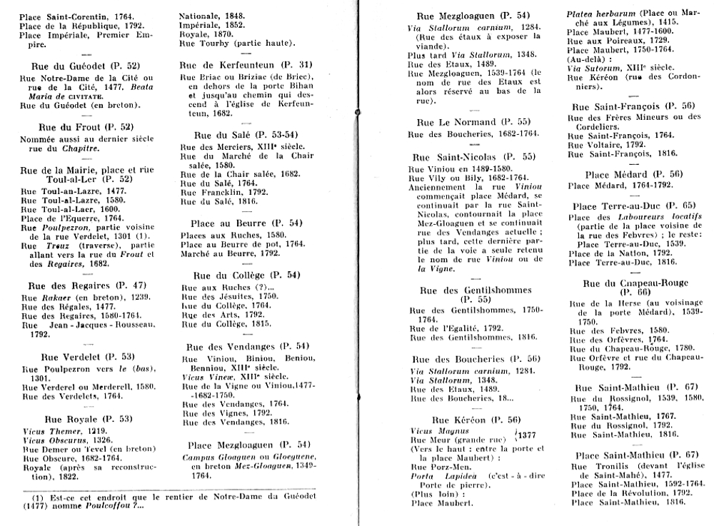 Il va sans dire que les noms bretons de nos rues ont été soumis dans le cours des siècles aux changements d'orthographe introduits par l'usage ; exemple : la rue nommée originairement Toul-an-Lazr (Trou du Cuir), du voisinage des tanneries qui existaient encore à la fin du dernier siècle ; son nom est écrit Toul-al-Laer par le chanoine Moreau, et il s'écrit aujourd'hui Toul-al-Ler [Note : Quelques personnes traduisent le nom Toul-al-Laer par Trou du voleur ; mais la forme primitive du nom de la place ne laisse aucun doute sur le sens]. D'autres noms en s'altérant sont devenus méconnaissables : par exemple, la ruelle an Douar, an Douaric (aveu de l'Evêque 1682) est inscrite sur le plan de 1764 sous le nom de rue Dorée qui n'est assurément pas la traduction de an Douar. Si nous avions la version latine de an Douar, nous ne serions pas embarrassés sur le sens de ce vieux nom [Note : An Douar mot à mot la Terre. Quelle terre ? — Question que le nom breton laisse indécise].