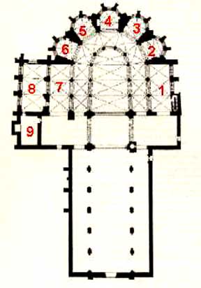 nef avec deux collatéraux, un choeur avec un déambulatoire, un transept et