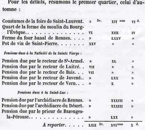Le total général de toutes ces portions congrues montait à 6.205 livres, 2 sols 10 deniers ; or le revenu de toutes les dîmes perçues par le Chapitre à cette époque n'atteignait que 24.037 livres. Mais certains revenus diminuèrent avec le temps : quelques pensions cessèrent d'être payées ; les dîmes des vins bretons récoltés dans les paroisses de Saint-Laurent, Toussaints, Saint-Hélier et Saint-Etienne de Rennes, affermées, en 1475, 60 livres par an, et rapportant, en 1488, trente pipes de vin, furent de nulle valeur dès 1640, « par suite du défrichement des vignes » (Registre des délibérations du Chapitre) ; plusieurs fondations s'éteignirent à Saint-Pierre ; enfin, le Chapitre fut imposé par le roi en 1516 et obligé, depuis lors, de payer chaque année environ 448 livres de décimes. Tout cela nous explique la modicité relative du revenu de chaque prébende canoniale. En 1640, chaque chanoine ne recevait que 12 mines de seigle, 4 mines de froment et 8 mines d'avoine, en tout 192 boisseaux (d'après D. Lobineau, qui évalue la mine à 8 boisseaux de roi), comme pension fixe ; c'était ce qu'on appelait le gros des prébendes ; il recueillait de plus, en distributions manuelles, environ 200 livres de rente, s'il assistait exactement à toutes les heures de l'office canonial. Voici quelles étaient les distributions manuelles en 1415 : « Pour savoir le nombre et la manière de la distribution de chacune sepmaine de l'an : La distribution cotidiane ès chanoines prébendez en liglise de Rennes par chacune sepmaine de l'an, quelle se comance à compter à none de chacun vendredi de l'an, est, s'il n'y a double, doze sols monnaye, et est de deiz-et-ouyt deniers par jour, dont y a à matines seix deniers, à prime dous deniers, à la grant messe dous deniers, à sexte dous deniers, à none dous deniers, à vespres dous deniers, à complies dous deniers ; au dimanche, pour la stacion, seix deniers ; au lundi et vendredi à chacun pour chappitre autres seix deniers, ainsi font celx doze sols, et en cestes distribucions mesmes et ès ensevantes distribucions chacun des quatre grans chappelains y prant une moitié de ce que un chanoine y prant. Et s'il y a aucune sepmaine où il y ait dimaine (dimanche) double ou feste double, quelle feste l'en pourra voir par le kalendrier, il y a pour chacun double doze deniers de croissance qui se croissent oultre le cotidian, scavoir est à primes vespres dous deniers, à matines du jour seix deniers, à prime dous deniers, à la grant messe dous deniers. Les complies de Karesme valent chacune quattre deniers de distribucion et en aultre temps ne valent que dous deniers. Et lorsqu'il avient processions ordinaires en la ville de Rennes hors du temps de Karesme il y a doze deniers de revenu, et ès processions quant len va hors la ville il y a dous sols de devoir à chacun chanoine, et ou temps de Karesme, à chacun mardi et vendredi, pour chacune procession il y a seix deniers et non plus » (Livre des Usages de l'Eglise de Rennes). D'après un tableau présenté à l'assemblée générale du clergé de France, en 1785, un canonicat ne produisait à Rennes, en ce temps-là, que 1.060 livres 6 sols 10 deniers par an, y compris les distributions quotidiennes, qui étaient alors de 30 sols, et qu'on perdait si l'on était absent plus de cinquante-deux jours par an ; les douze plus anciens chanoines recevaient en outre, comme nous l'avons dit précédemment, 250 livres pour indemnité de logement. A cette même époque (1785), le revenu total du Chapitre de Rennes, tant en dîmes qu'en rentes de diverses sortes, s'élevait à la somme de 50.675 livres 7 sols 2 deniers (Annales de l'Eglise de Rennes ms.). Quand vint la Révolution, voici, d'après la Déclaration du Chapitre du 26 février 1790, quels étaient ses revenus :
