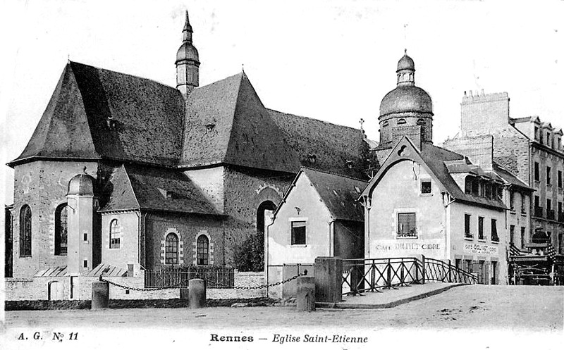 paroisse de Saint-Etienne. — Cette paroisse était jadis considérée comme la première et la plus ancienne de Rennes. Lorsqu'un nouvel évêque prenait possession de son siège il devait, avant d'entrer dans sa cathédrale, se rendre à Saint-Etienne et y prêter entre les mains du recteur un serment de fidélité aux coutumes du diocèse. Le recteur de Saint-Etienne avait toujours d'ailleurs la première place parmi les recteurs aux processions générale (nota : Après lui marchaient, dans le dernier siècle, le recteur de Toussaints, puis celui de Saint-Germain. Les sept autres recteurs se plaçaient par ordre d'ancienneté, suivant la date de leur prise de possession. On voit que cet ordre de préséance différait complètement de celui admis en 1415, sauf pour le recteur de Saint-Etienne occupant de tout temps le premier rang) ; il était appelé le premier au synode, et c'était chez lui que se réunissaient les autres recteurs de Rennes quand des affaires communes d'administration exigeaient qu'ils s'assemblassent. Cependant le recteur de Saint-Etienne, présenté par l'un des membres du Chapitre de Rennes, n'était considéré à l'origine que comme un vicaire perpétuel, le Chapitre se réservant en cette paroisse les droits de recteur primitif. Dès le XIIème siècle, en effet, le pape Alexandre III (1159-1181) confirma les chanoines de Rennes dans la possession de l'église Saint-Etienne, de ses dîmes et de ses autres dépendances, « ecclesiam Sancti Stephani Redonensis cum decimationibus et aliis appendiciis suis ». (Necrol. Sancti Petri Redon.). La présentation de la cure de Saint-Etienne, bénéfice monoculaire, fut attribuée au chanoine de Rennes jouissant de la quatrième prébende. Pour maintenir ses droits à Saint-Etienne, le Chapitre se rendait assez fréquemment en cette paroisse : il y allait en procession et y chantait la grand'messe le jour Saint-Etienne (26 décembre) ; il y recueillait même ce jour-là la moitié des oblations faites au maître-autel ; il y retournait processionnellement chanter la grand'messe à la fête de saint Grégoire (12 mars) et y faisait la procession des Rameaux le dimanche des « Pasques fleuries ». A la Quasimodo, nouvelle assemblée de l'évêque et de ses chanoines dans l'église et le cimetière de Saint-Etienne, pour le jeu des pelotes et pour recevoir deux florins et demi d'or que le recteur devait au Chapitre. Enfin le 3 août, fête de l'Invention du corps de saint Etienne, le Chapitre allait en procession dire la grand'messe à l'autel de la Vierge en l'église Saint-Etienne (nota : Au siècle dernier, les recteurs de Saint-Etienne cherchèrent à se soustraire à cette autorité du Chapitre dans leur église ; le 26 décembre 1761, notamment, le recteur, M. de Châteaubriant, fit dire une grand'messe paroissiale avant l'arrivée des chanoines, n'alla point leur présenter l'eau bénite et refusa de quitter son étole pastorale pendant la grand'messe chantée par le Chapitre. Il fut poursuivi pour cet acte de rébellion et condamné à rendre aux chanoines les devoirs accoutumés. Un arrêt du Parlement, daté du 15 juin 1763, défendit même à tous les recteurs de Rennes de porter l’étole, malgré le Chapitre, aux processions générales et à la cathédrale). Les chanoines abandonnèrent au recteur de Saint-Etienne toutes les dîmes qu'ils levaient en cette paroisse pour lui tenir lieu de portion congrue. En 1790, le recteur, M. de Forsanz, déclara qu'il jouissait de ce qui suit : le presbytère et son jardin, situés près de l'église Saint-Etienne, joignant au Midi la rue d'Echange, à l'Ouest le cimetière Saint-Etienne et à l'Est le jardin de Bonne-Nouvelle ; — la totalité des dîmes de la paroisse, valant de 1 800 livres à 2 000 livres ; — une rente foncière de 19 livres 12 sols 6 deniers sur le terrain de Mauvinet, près de Saint-Cyr ; — et un casuel estimé 400 livres. C'était un total brut d'environ 2 400 livres. Mais les charges consistaient en la pension de deux vicaires, le paiement des décimes et l'entretien du chanceau et du presbytère (Archives départementales d'Ille-et-Vilaine, 9 G, 54 ; I V, 26. — La fabrique de Saint-Etienne avait aux siècles derniers le droit de faire la quête à la porte de la cathédrale pendant tout l'Avent, et le lundi des Rogations à Saint-Cyr, lorsque le Chapitre y venait en procession). La paroisse Saint-Etienne renfermait autrefois le territoire de Bréquigny, et la chapelle de ce manoir fut pendant quelque temps considérée comme vicariale ; nous en reparlerons plus loin.