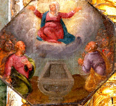 1° Le retable de la chapelle de la Vierge, dite chapelle du Rosaire, est sculpté richement. Le contour du bas de ses colonnes est couvert de petits anges soutenant des couronnes. Les chapiteaux sont d'ordre composite. Au-dessus de l'entablement est représenté le Père Eternel, entouré d'anges et plus bas le Saint-Esprit. Les statues de la Vierge et de l'ange Gabriel, étaient autrefois dans les niches qui ornent cet autel ; elles ont été remplacées par une statue de la Vierge et par celle de sainte Catherine.