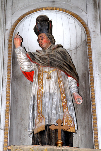 4° Retable du XVIIIème siècle d'un autel latéral. Situé du côté de l'Epitre, il s'agit de l'autel de saint Yves. Au milieu du retable est un joli tableau du saint. L'autel est terminé par un pilastre sur les deux côtés. Plus au milieu deux grandes colonnes supportent un entablement, surmonté d'un fronton, au-dessus duquel est une gloire. Les deux statues qui ornent cet autel sont celles de saint Yves et de saint Alphonse de Liguori.
