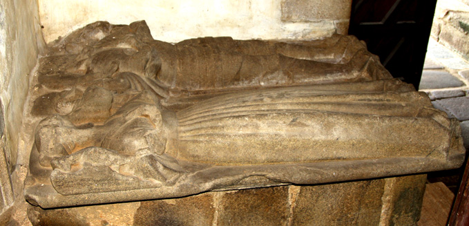 7° Un tombeau (XVème siècle) en bas de l'église avec statues tumulaires très martelées, probablement des du Parc, seigneurs de la Roche-Jagu. Il s'agit, semble-t-il, de Henri du Parc et Catherine de Kersaliou (ou Kersalliou) son épouse.