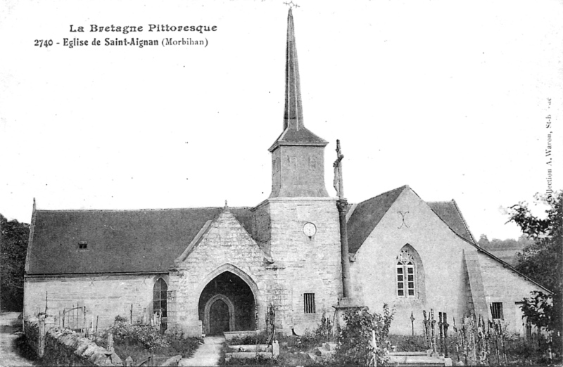 Nota : En 1221, l'église de Saint-Aignan existait déjà, car Olivier, vicomte de Rohan, en confirmant, à cette date, les dons faits par ses prédécesseurs à l'abbaye de Bon-Repos, mentionne les terres situées entre le pré qui touche à l'église de Saint-Aignan, en remontant jusqu'à la croix de Troguennant, et en descendant de là jusqu'au Blavet (Pr. I. 848). L'église, d'abord tréviale, puis paroissiale, restaurée en 1894, est sous l'invocation de saint Aignan. On y trouve quelques restes d'une architecture flamboyante ; par ailleurs rien d'intéressant, si ce n'est un bel arbre de Jessé, qui fait l'admiration de tous les visiteurs. Les registres remontent à 1671 seulement. Les chapelles publiques sont : — 1° Saint-Marc, à 4 kilomètres vers l'ouest. — 2° Saint-Ignace, à 8 kilomètres vers l'ouest, dans la forêt; pèlerinage assez fréquenté le dimanche qui suit le 15 août. Quant aux chapellenies, on n'en connaît aucune. Saint-Aignan, comme Cléguérec, faisait partie de la vicomté de Rohan, du doyenné de Guémené et de la sénéchaussée de Ploërmel. En 1790, il fut érigé en commune, du canton de Cléguérec et du district de Pontivy. Son curé, M. Baudic, refusa le serment en 1791. A la restauration du culte en 1802, cette commune obtint le titre de paroisse succursale, avantage qu'elle a toujours conservé depuis (J-M. Le Mené).