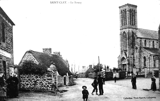 Nota 1 : Sa vieille église tréviale était bâtie sur l'emplacement occupé en 1945 par les cafés Le Moal et Savidan. Elle se composait d'une nef avec deux bas-côtés, deux transepts et un chevet droit. Les arcades qui marquaient les transepts étaient à plein cintre avec chanfreins et reposaient sur des piliers cylindriques dont les chapiteaux n'étaient que de simples tailloirs. Le transept nord était éclairé, à l'est par une large fenêtre séparée en quatre baies par des meneaux soutenant un réseau quadrilobé ; dans chacun des collatéraux existaient des fenêtres à simple meneau soutenant une petite rose à quatre feuilles. Au centre de la nef on remarquait dans le dallage une belle dalle funéraire portant ces mots : « GWILLE DE LAVILLEON » avec la date de 1551. Dans l'ensemble, l'édifice était assez mesquin et irrégulier. L'église était des plus vieilles de Bretagne puisque l'un des pignons portait l'année 1010. L'église actuelle date de 1870. C'est un bâtiment d'aspect solide mais sans grande élégance, et flanqué d'un clocher carré, qui donne l'impression d'être inachevé. Elle est l'âme de la commune. Lorsqu'on y pénètre, on est frappé par sa simplicité, sa sobriété. Les vitraux modernes laissent filtrer un jour blafard. Ses bas-côtés sont coiffés d'une voûte ogivale. Son maître-autel, finement ciselé, est surmonté d'un chapeau ogival bleu ciel parsemé de fines étoiles d'or. De chaque côté de l'autel, le visiteur peut voir un Saint Michel terrassant le démon, et une Jeanne d'Arc, l'étendard à la main dans sa pose immortalisée. La bénédiction de la première pierre eut lieu le 22 mai 1868, et celle de l'église le 6 mars 1870. L’église eut comme recteurs : MM. Les Abbés : Hamon de 1856 à 1871 ; Herviou, de 1871 à 1880 ; Evenou, de 1880 à 1888 ; Bergot, de 1888 à 1897 ; Paturel, de 1897 à 1907. (L'église resta quelques temps sans recteur) [Note : Expulsion des prêtres de Saint-Clet, le 12 octobre 1907 — A 7 heures du matin, le samedi 12 octobre 1907, arrivent au bourg de Saint-Clet, trois brigades de gendarmerie sous le commandement du lieutenant de Guingamp, deux sapeurs du 48ème d'infanterie, un conducteur de fourgon et un tambour de Pontrieux, tous conduits par M. Hengoat, maire de Saint-Clet, ceint de son écharpe. Toutes les portes du presbytères étaient fermées à clef. Trois sommations du maire alternant avec trois roulements de tambour, restent sans réponse. Alors un sapeur vient facilement à bout du portail et les représentants de la loi entrent dans la cour. Même scène devant la porte de la maison, qui cède sous les coups de hache. Les hommes de loi, sous la protection des gendarmes, entrent dans le presbytère. Le maire les conduit à la chambre de M. le Recteur. La porte fermée à clef est enfoncée à coups de massue après les sommations officielles restées sans réponse et les défenseurs de la propriété envahissent celle des autres. Le maire somme M. le Recteur de sortir au nom de la loi. Sur son refus, un gendarme le fait sortir jusqu'à la place, Même cérémonie chez M. le Vicaire. La foule retenue par les gendarmes se dirige vers l'église où les deux prêtres se sont réfugiés. Le lendemain, après une messe basse, dite à 10 heures, le recteur et le vicaire quittent l'église, emportant le Saint-Sacrement qu'ils transportèrent à Saint-Gilles-les-Bois. La lampe du sanctuaire fut éteinte, l'église fermée et la paroisse supprimée fut attachée, partie à Pontrieux, partie à Saint-Gilles] ; Chevance, 1908 à 1911 ; Rocher, 1911 à 1919 ; Pérédo, 1919 à 1935 ; Le Roy (à partir de 1935), … Si nous grimpons jusqu'au haut de la tour, nous découvrons un panorama vraiment pittoresque. Faisons visite à nos grosses cloches. Ces demoiselles supportent gaillardement leurs soixante printemps. Voici, face à Guingamp, Mlle Amélie, que nous devons à la générosité des habitants de Saint-Clet, et qui eut pour parrain et marraine : M. Pérennès, maire de Saint-Clet, et Marguerite Lecain, épouse de Nicolas Bénech. Face à Pontrieux, Marianne, plus légère que ses soeurs, dont les parrain et marraine furent M. Gilles Le Menguy et Mme Marie-Jeanne Guillou, épouse Cozannet. Enfin, Augustine, dont le parrain fut M. François Le Calvez, trésorier de la Fabrique, la marraine Mlle Augustine Le Cain. Les cloches restent l'âme de la commune ; cloches des heures gaies pour le nouveau-né ou la jeune épousée, cloches des heures tristes pour la mort et le deuil. Cloches, combien de fois n'avez-vous pas résonné dans nos coeurs tour à tour meurtris et joyeux restant le symbole de la souffrance et de la joie ? Le jour du pardon de Saint-Clet, le deuxième dimanche de juillet, les cloches reprennent leur joyeuse envolée, et jeunes gens et jeunes filles s'en donnent à coeur joie sur l'unique manège criard de la place (R. Kjölner).