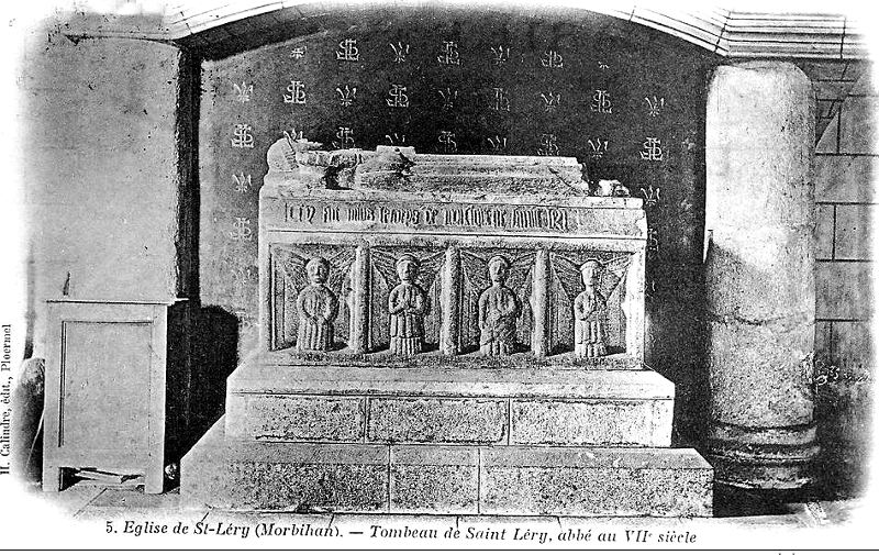 Nota : L'église actuelle de Saint-Léry est une oeuvre du XVème siècle, sauf le choeur qui est neuf. Il y avait primitivement deux transepts, séparés chacun du choeur par deux arcades ogivales, mais la chapelle du nord a été supprimée depuis. La porte de l'ouest, en ogive, est surmontée d'une niche à plein cintre et trilobe ; celle du sud, en anse de panier, est décorée d'une accolade, d'anges et de divers personnages. Les fenêtres sont ogivales, avec meneaux en quintefeuille au bras sud, et une rose à sept feuilles au nord de la nef. « Une chapelle particulière, placée à l'aisselle de la nef et du transept sud, passe pour avoir été construite par ordre de la duchesse Anne ; bâtie en grand et moyen appareil, couverte d'une toiture spéciale, flanquée de contreforts à pinacles sculptés, elle est décorée d'une large fenêtre à meneaux flamboyants ; de beaux vitraux, à devises gothiques, dont il reste huit panneaux, semblent figurer les principaux traits de la vie de la sainte Vierge, et représentent en réalité l'union de la duchesse Anne avec Charles VIII, roi de France ; dans le bas se voient, en effet, les armes de France, seules ou unies à celles de Bretagne ; on y lit aussi la date de 1493, et le nom de Berman, vitrier à Rennes... La porte, en anse de panier et accolade, est entourée de sculptures : d'une part, un personnage dévoré par les vices sous la forme de monstres ; d'une autre part, saint Michel terrassant le démon, puis la Salutation angélique, et au-dessus, dans une niche, l'écusson de Bretagne, avec cimier et supports » (Stat. Rosenzweig). Au bas de l'accolade, des anges tiennent les écussons de Bretagne et de Jean l'Epervier, évêque de Saint-Malo (1450-1486), ce qui prouve que l'oeuvre avait été commencée avant l'avènement de la duchesse Anne. Au nord de la nef, se voit le tombeau de saint Léry, haut de plus d'un mètre. Le saint est représenté couché, tenant la crosse d'une main, un livre de l'autre et appuyant les pieds sur un lévrier. Sur le devant sont sculptés quatre anges en prière, séparés par des colonnettes ; sur la bordure de la table se lit une inscription gothique en relief : Cy fut mips te corps de monsigneur sainct Léri. Au-dessus du tombeau, on remarque un petit bas-relief en bois, du XVIème siècle, représentant la mort de saint Léry, son convoi et son exaltation. Le recteur, nommé à l'alternative dans les derniers temps, jouissait en 1730 d'un revenu net de 260 livres. Saint-Léry était du doyenné de Montfort, de la seigneurie de Gaël, et de la sénéchaussée de Ploërmel. En 1790, il fut érigé en commune, du canton de Mauron, du district de Ploërmel, et du département du Morbihan. Son recteur Alexandre Duclos, refusa le serment en 1791, et dut s'exiler l'année suivante. Guillaume Jouan, prêtre de l'endroit, fut déporté à l'île de Ré en 1799. Saint-Léry fut, à la suite du concordat de 1801, annexé au nouveau diocèse de Vannes, et maintenu comme paroisse en 1802 (J-M. Le Mené).