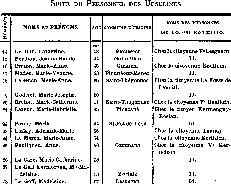 Cette liste, telle qu'elle est donnée par la municipalité de Saint-Pol, est loin d'être exacte. Quand nous avons fait notre travail sur Plougoulm, nous avons eu entre les mains la liste de toutes les religieuses Ursulines, au moment de leur expulsion. Cette liste avait été faite alors et était restée dans les archives de la communauté. Elles étaient au nombre de 37 religieuses de chœur, de 12 sœurs converses, de 2 novices de chœur et d'une postulante converse.