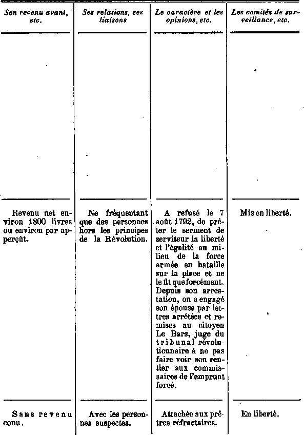 Pour ne pas tomber dans des redites, en rapportant tous les mandats d'arrêt lancés par le comité de surveillance, nous reproduisons ici un tableau fort intéressant, expédié dans le courant de ventôse par le comité de Salut public de Paris, à tous les comités de surveillance des départements de la République. L'ancien secrétaire de la mairie de Saint-Pol, M. Henry, eut l'obligeance de nous donner communication de ce tableau dont l'original se trouve aux archives départementales.