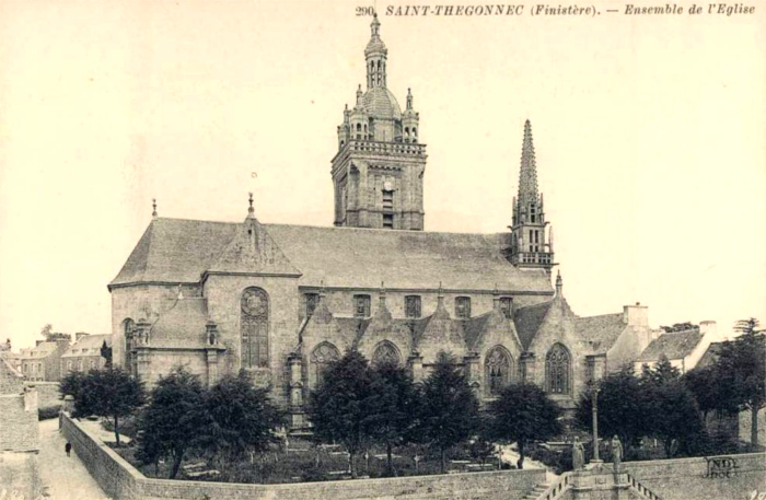Nota 1 : Liste non exhaustive des recteurs de la paroisse de Saint-Thégonnec : Jean Bouguen (1610-1630). Guillaume Prouff (1630-30 mai 1660). Yves de La Haye, seigneur des Roches (6 juillet 1661-1665). Yves de Bouvens (1665-1673). Jean-Armand Harscouet, inhumé dans l'église (1674-1712). Maurice Joncour (1712-15 juin 1721). Joseph de Gruel, du diocèse de Séez (1721-1726). François Mahoudeau, inhumé dans l'église (1726-28 septembre 1752). Hervé Donval, ancien missionnaire, mort à l'âge de 55 ans, inhumé dans le cimetière (mars 1752- 17 avril 1758). François Cazuc (mai 1758, se démet en juin 1758). Guillaume Labbat, âgé de 88 ans, inhumé dans le cimetière (juin 1758-4 septembre 1783). François Migeot, âgé de 33 ans (mars 1784-13 mai 1787). René-Marie Abjean, nommé en novembre 1787, détenu aux Carmes, émigré en Angleterre en 1791. Allanet, curé constitutionnel (mai 1791-1793). Le Frout, curé constitutionnel, élu le 13 floréal an II. — Il ne put présenter son institution canonique. — Les vicaires épiscopaux ne voulurent pas la lui remettre. François Abgrall et Alain Le Roux signent tous deux « curé d'office ou prêtre préposé à la desserte de Saint-Thégonnec » (1791-1801), etc ... Liste non exhaustive des curés de Saint-Thégonnec : Guillaume Richou, mort à l'hôpital de Morlaix (janvier 1804-14 février 1809). François-Marie Pelléteur, mort à l'âge de 68 ans (20 octobre 1809-14 février 1816). Hervé-Marie Cloarec, âgé de 58 ans (1816-12 novembre 1818). Louis Tanguy, inhumé dans le cimetière (181930 juin 1847). Coquil, ancien recteur de Kerfeunteun, enterré à Guiclan (septembre 1847-18 octobre 1847). Jean-Yves Bériet, ancien recteur de Plougouven, chanoine honoraire le 29 mars 1874, décédé à Pougues-les-Eaux (Nièvre), le 8 août 1874, inhumé dans le cimetière de Saint-Thégonnec (1847-12 août 1874). Corentin Toulemont, ancien recteur du Conquet, nommé curé-doyen de Saint-Renan, le 2 février 1878, chanoine titulaire de l'église cathédrale de Quimper en 1891, mort à Quimper en 1904, inhumé à Pont-l'Abbé (1874-1878). Laurent André, vicaire de Saint-Thégonnec en 1856, et ancien curé de Bannalec (3 février 1878-1881). Guy Grall, ancien recteur de Plouénan (7 juillet 1881-1883). Elie-Marie Abjean, ancien recteur de Kersaint (29 décembre 1883-1893). Jacques-Marie Colin, né à Lambezellec, mars 1848, vicaire à Ploaré en 1872, puis à Douarnenez, lors de la fondation de cette paroisse, en 1875, recteur de Camaret en 1889, puis curé de Saint-Thégonnec le 6 mai 1893, etc ...