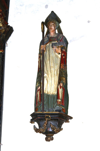 La statue de Saint Corentin, en bois polychrome, est du XVIème siècle. Saint Corentin est le premier évêque de Quimper et selon la tradition, fondateur du culte de Sainte Anne à la Palud. Il nous est présenté avec mitre, crosse pastorale et évangéliaire ouvert sur lequel est écrit : " Verbum Dei, Parole de Dieu " ; sur son étole : saint Nicolas, saint Laurent, saint Etienne et deux saints évêques anonymes.